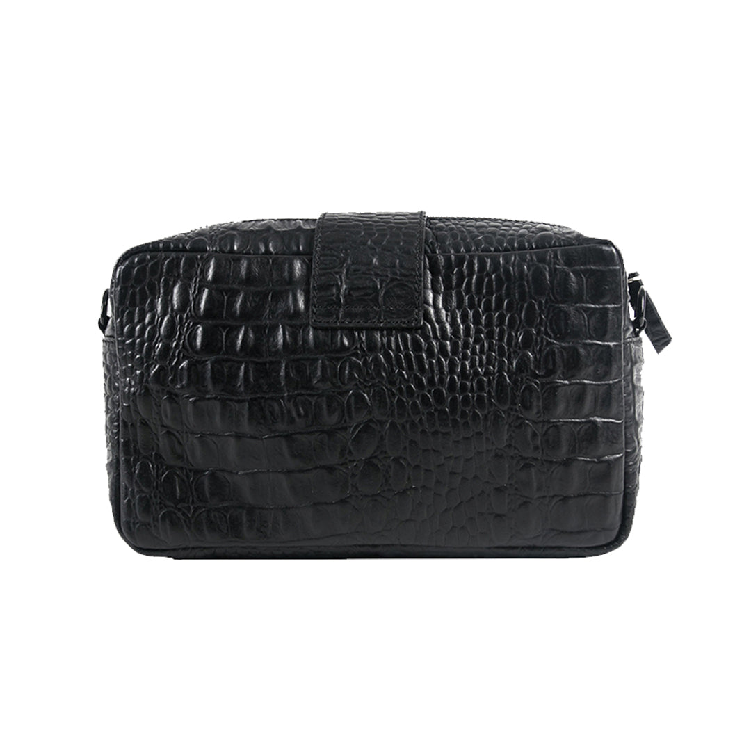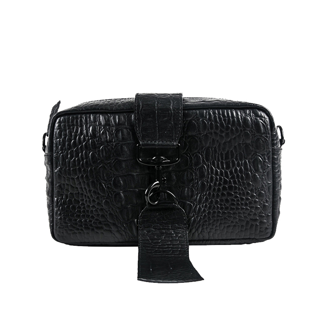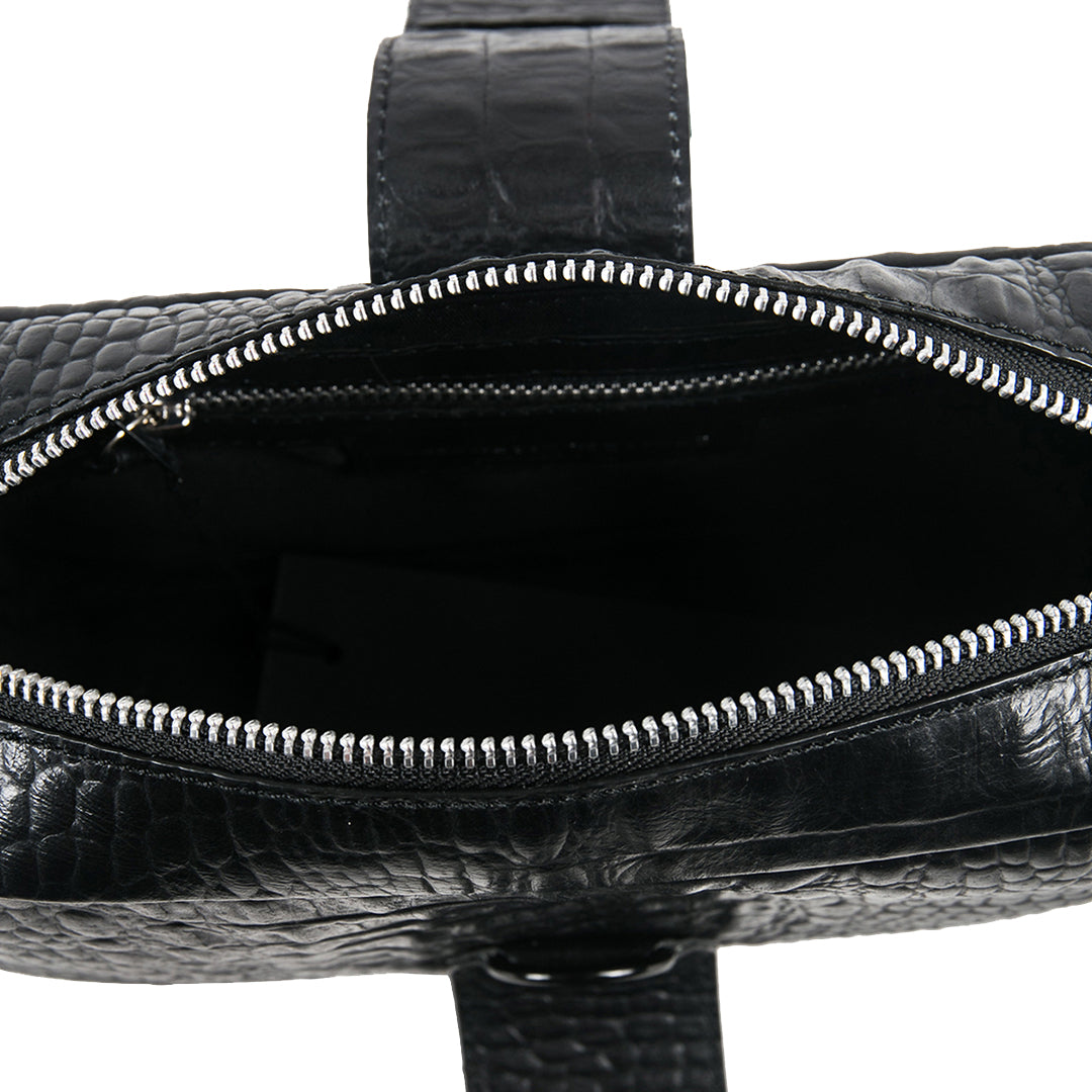 The Aesthetic Pleasure Kill Croc Black Bag is a minimalist crossbody bag. It features a detachable long strap, allowing for versatile wear as a crossbody or handheld accessory. The bag's standout detail is a vertical belt and secured with a zipper closure