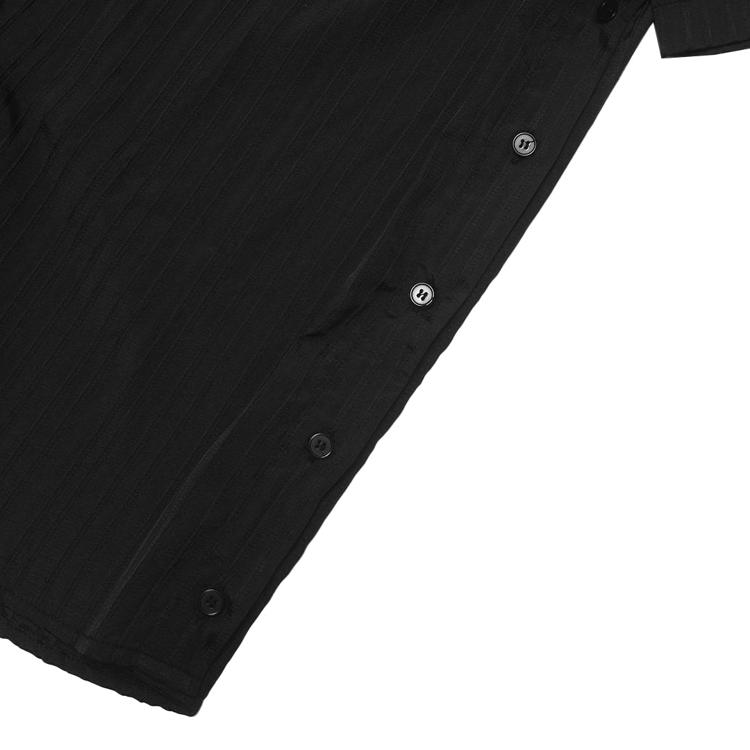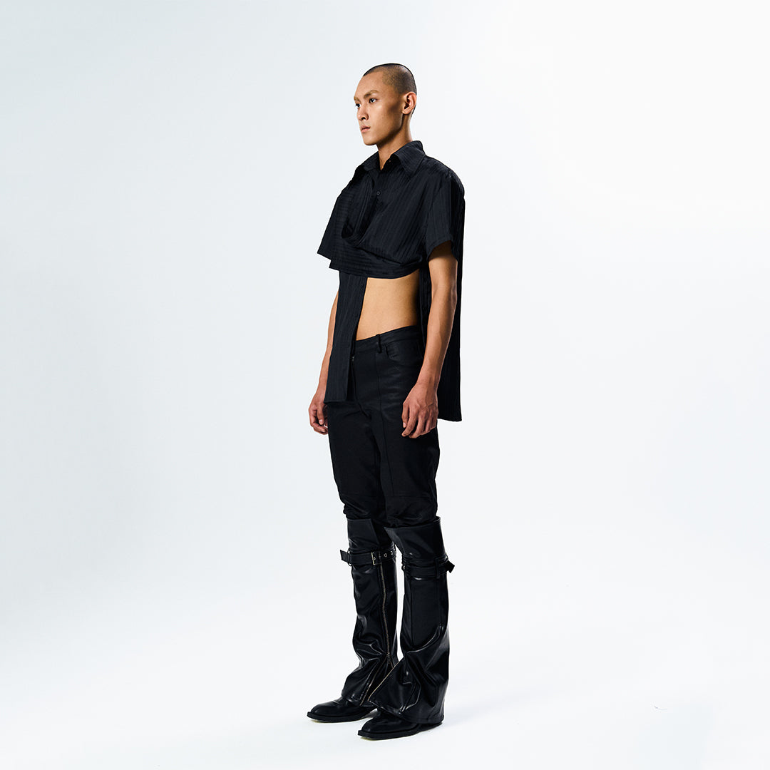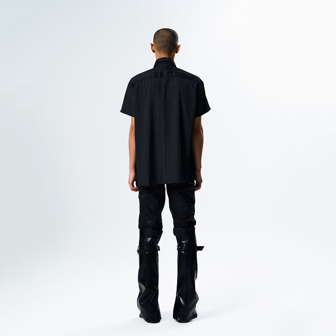 Short Sleeve Draping Cowl Shirt in black redefines the classic button-up with innovative design elements. This shirt transforms with a unique convertible draped cowl detail that can be styled multiple ways — worn traditionally or twisted into a bold, sculptural silhouette
