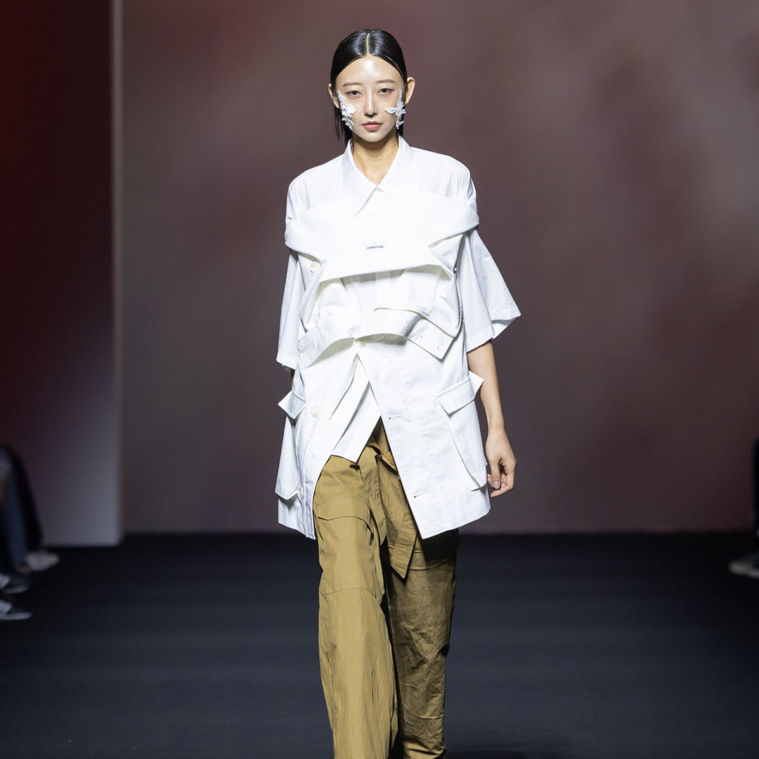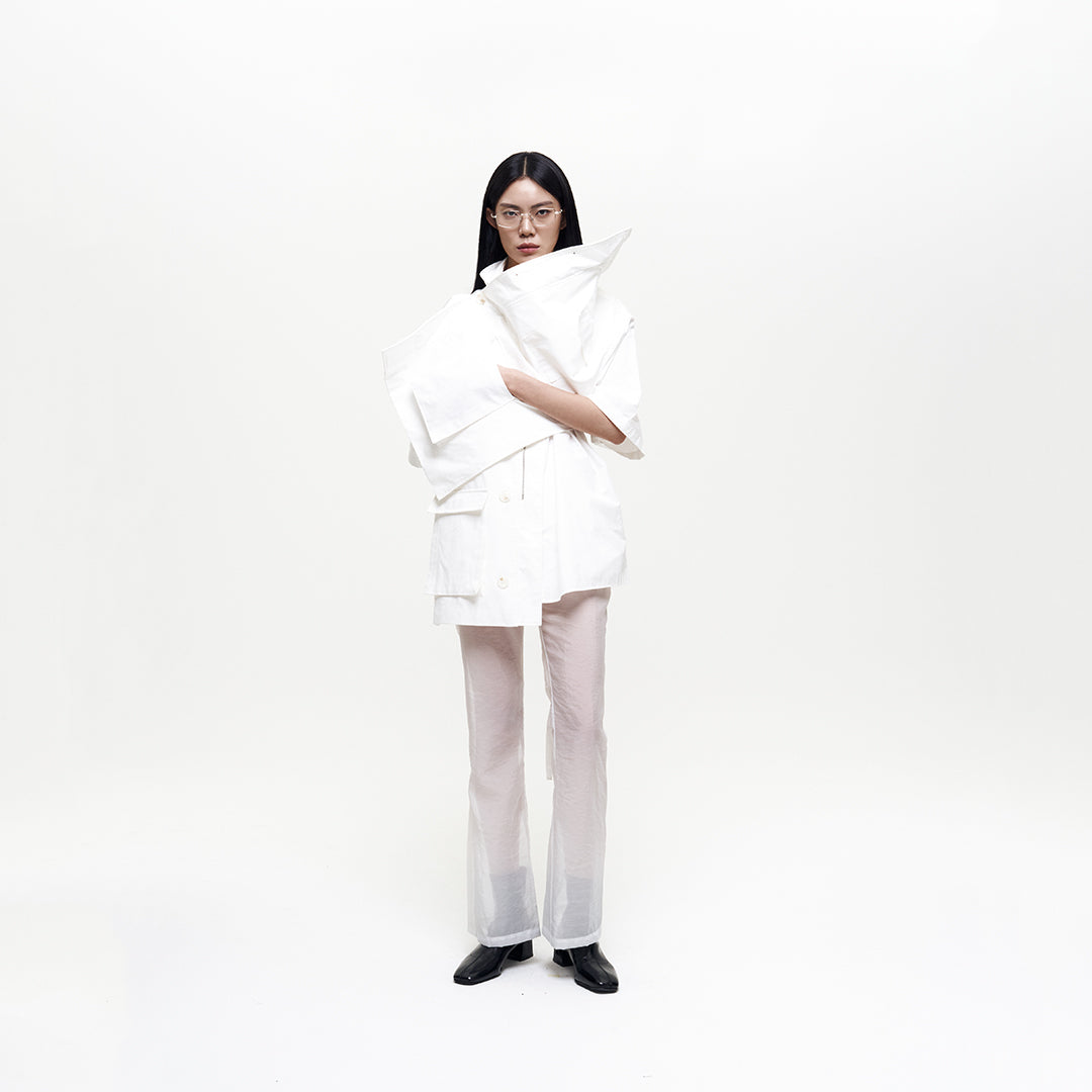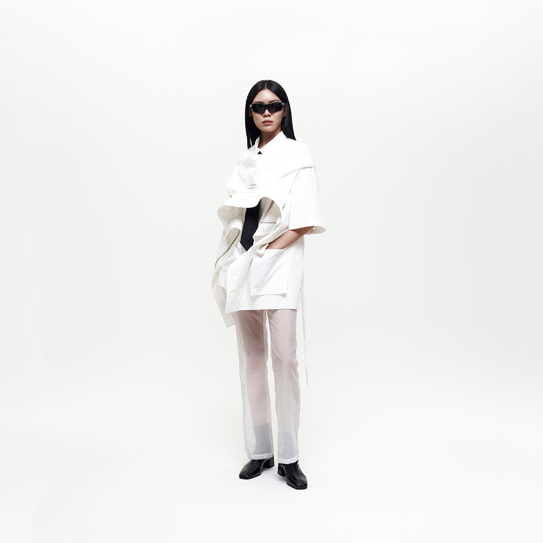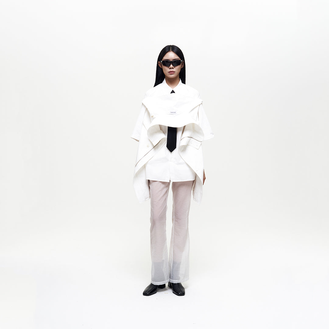 This Technical Vest Shirt features integrated vest-style paneling and functional pockets, combining a tailored silhouette with practical, modular design. The layered construction allows for unique styling options, whether worn symmetrically or draped asymmetrically for an avant-garde twist.