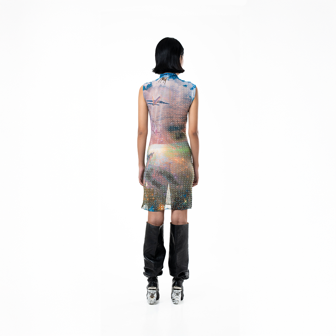 Short sleeveless dress in printed mesh with cutout detail on chest