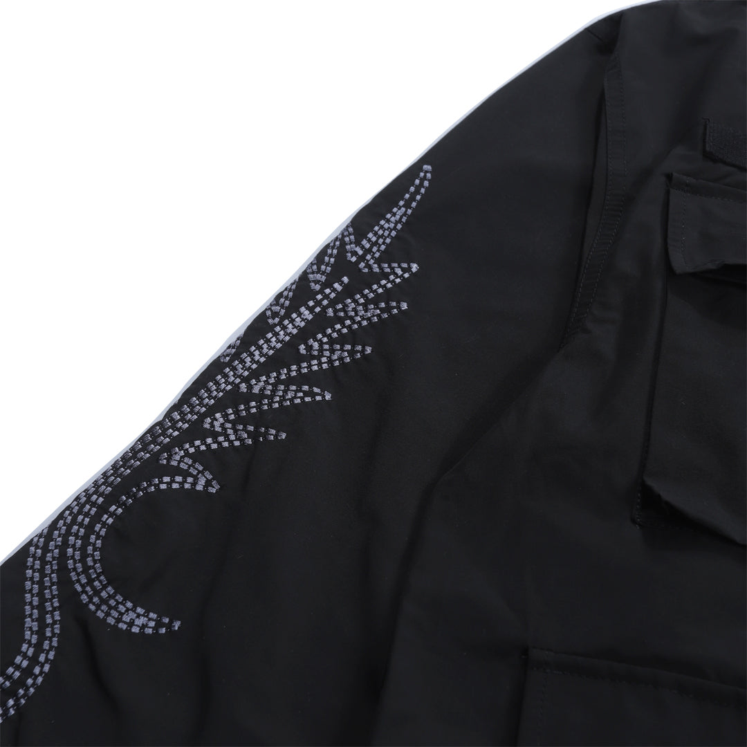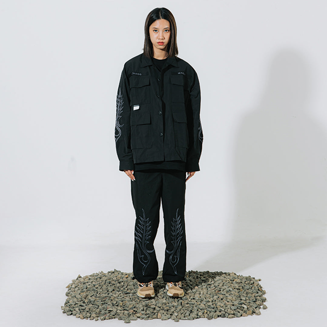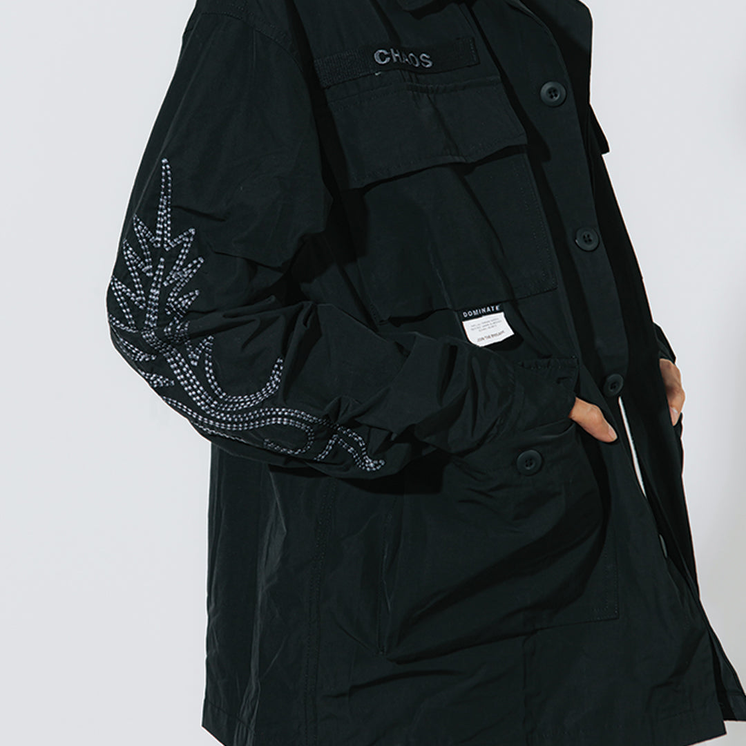 This BDU jacket was inspired by the uniform of special forces in 1952 with a mix of modernist military looks. The jacket consists of 4-panel pockets on the front and direct embroidery on the sleeve The textured nylon fabric in palettes is representing the dynamic nature of contemporary daily style. Suits for a first outer choice when it comes to style.