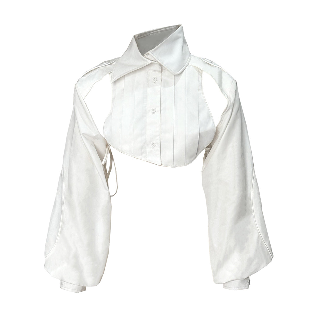Cropped pleated shirt with cut-outs around the bodice with adjustable side ties. The shirt features balloon sleeves with structured cuffs and asymmetrical two-piece collar.