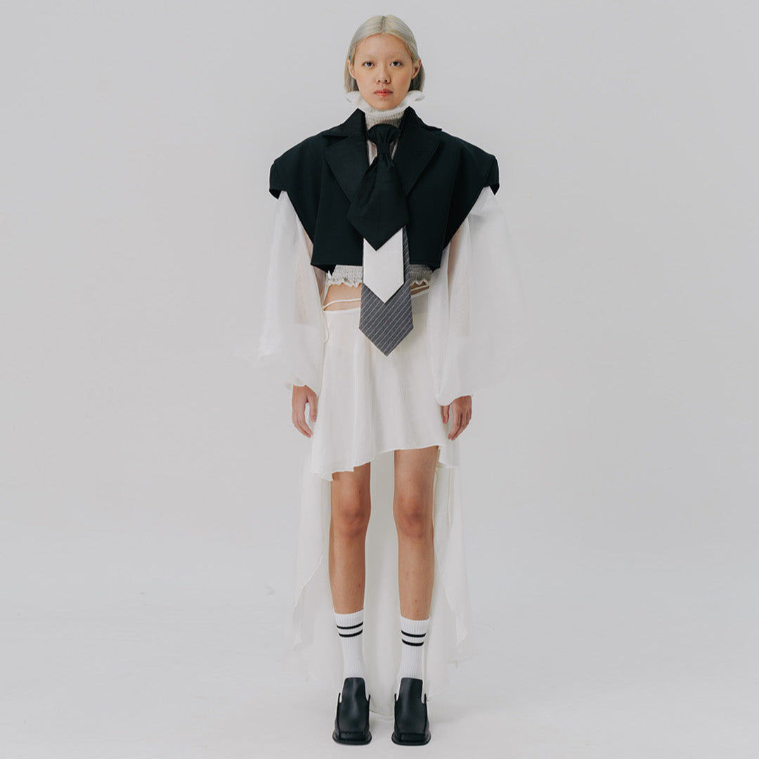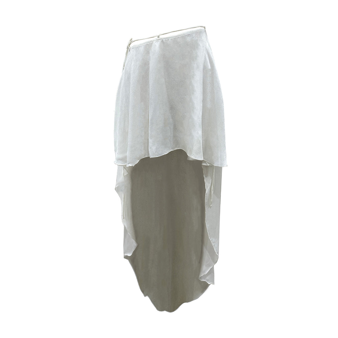 Asymmetrical skirt with a slant waist line and a small rouleaux tie as a belt. The skirt features adjustable ribbon ties on both sides transforming it into a different silhouette.