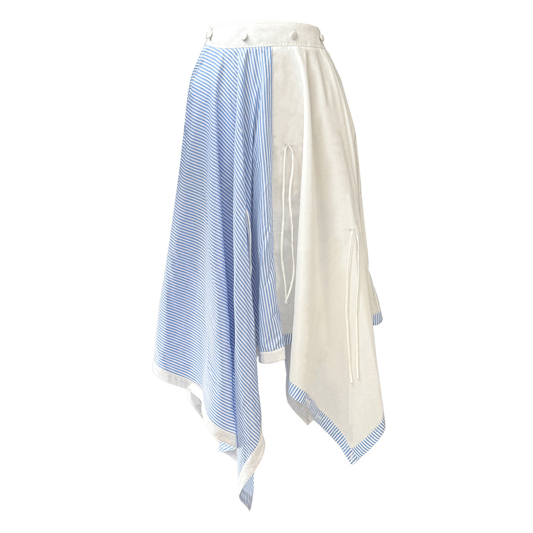 Handkerchief skirt with asymmetrical hem and patchwork construction. The skirt features a transformable silhouette by tying the ribbons on the skirts to the buttons on the waistband.
