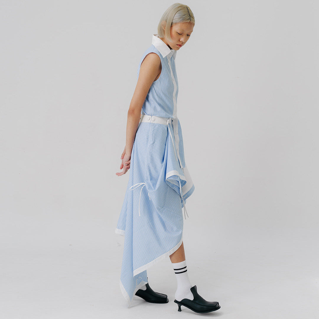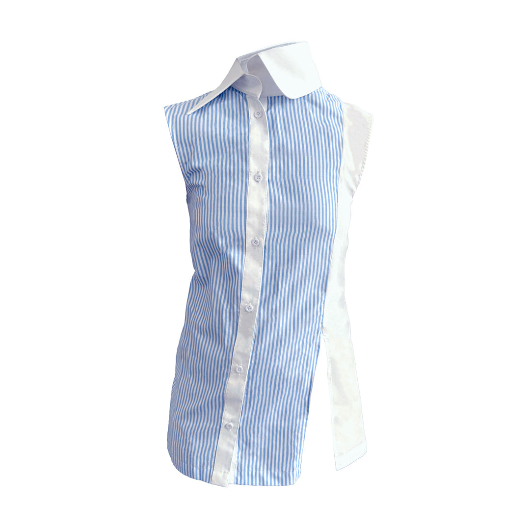Sleeveless shirt with asymmetrical two-piece collar and button stands. The shirt features a cut on the left hem and a contrast white panel that accentuates the design.