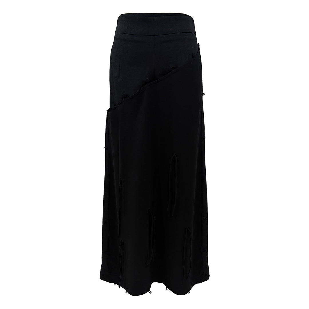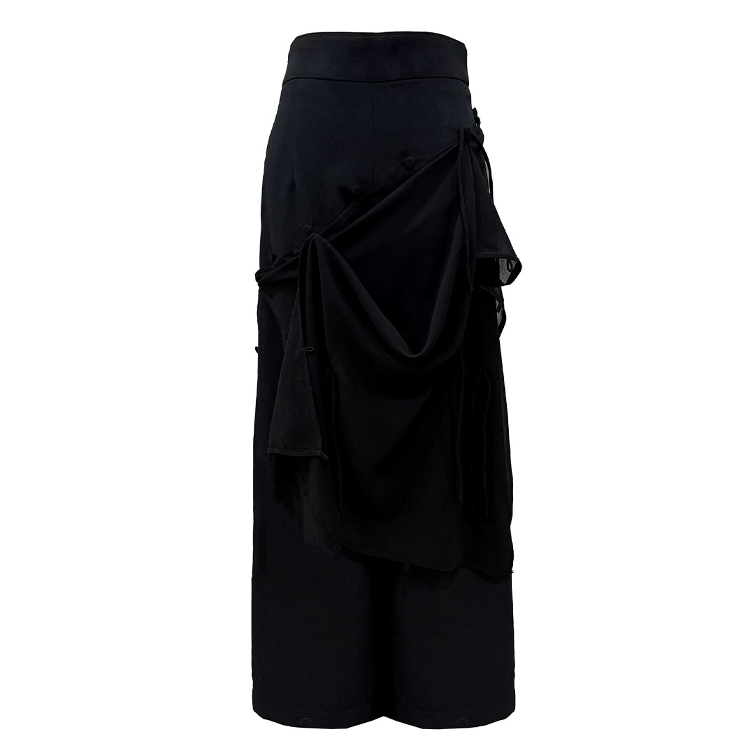 A versatile trouser that transforms between a trouser skirt and a jumpsuit. it features a skirt panel with adjustable buttons and ties for styling flexibility.