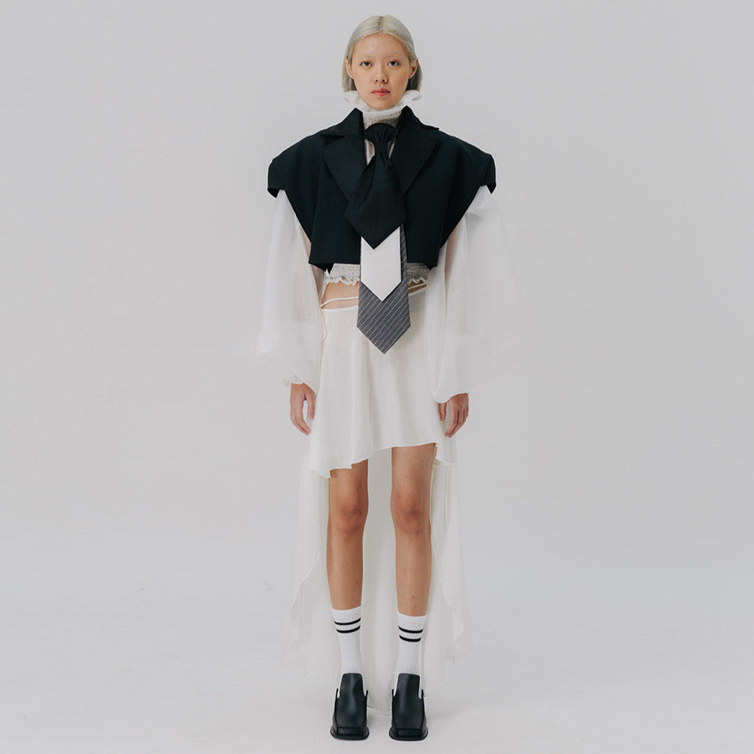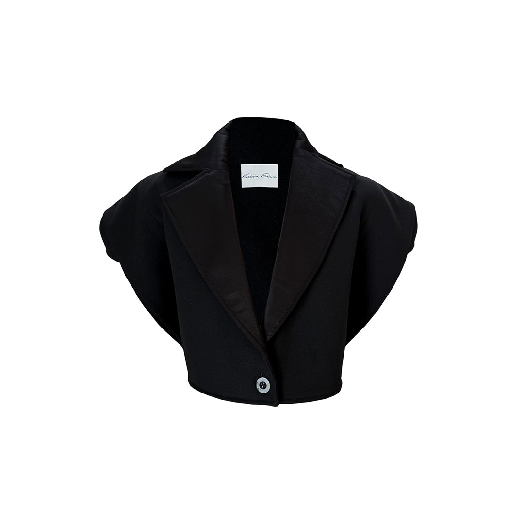 Oversized cropped blazer with padded bodice. The blazer features asymmetrical lapels rendered in contrasting satin fabric as lining forming into another new garment that can be worn inside out. With buttons on each side seams, the blazer can be worn with opened sides or buttoned changing it into entire different silhouettes.