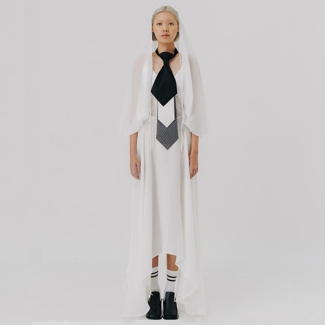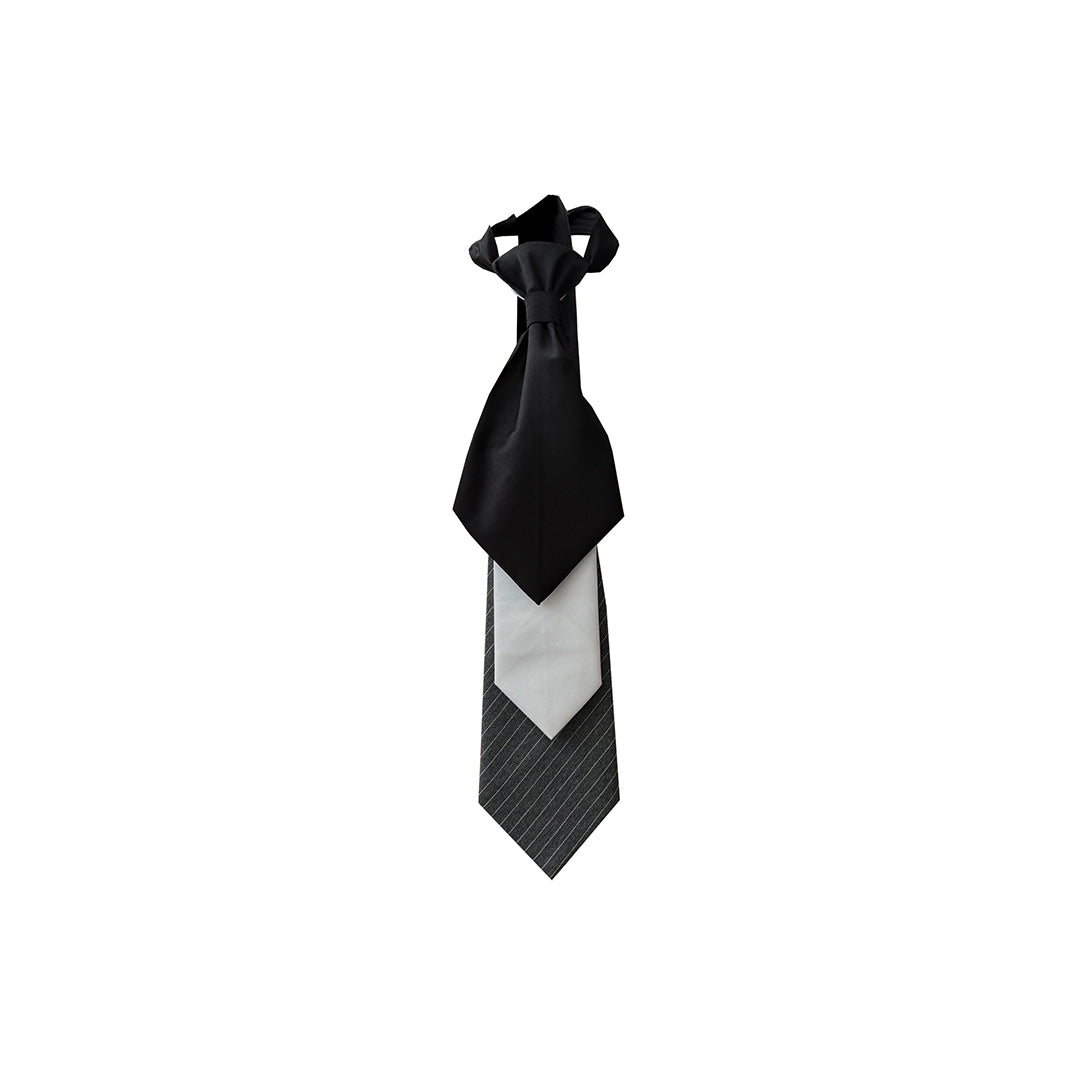 Asymmetrical layered tie in contrast fabrics with white cotton, black and grey pinstripes semi wool. The tie neckpiece can be worn as a belt.