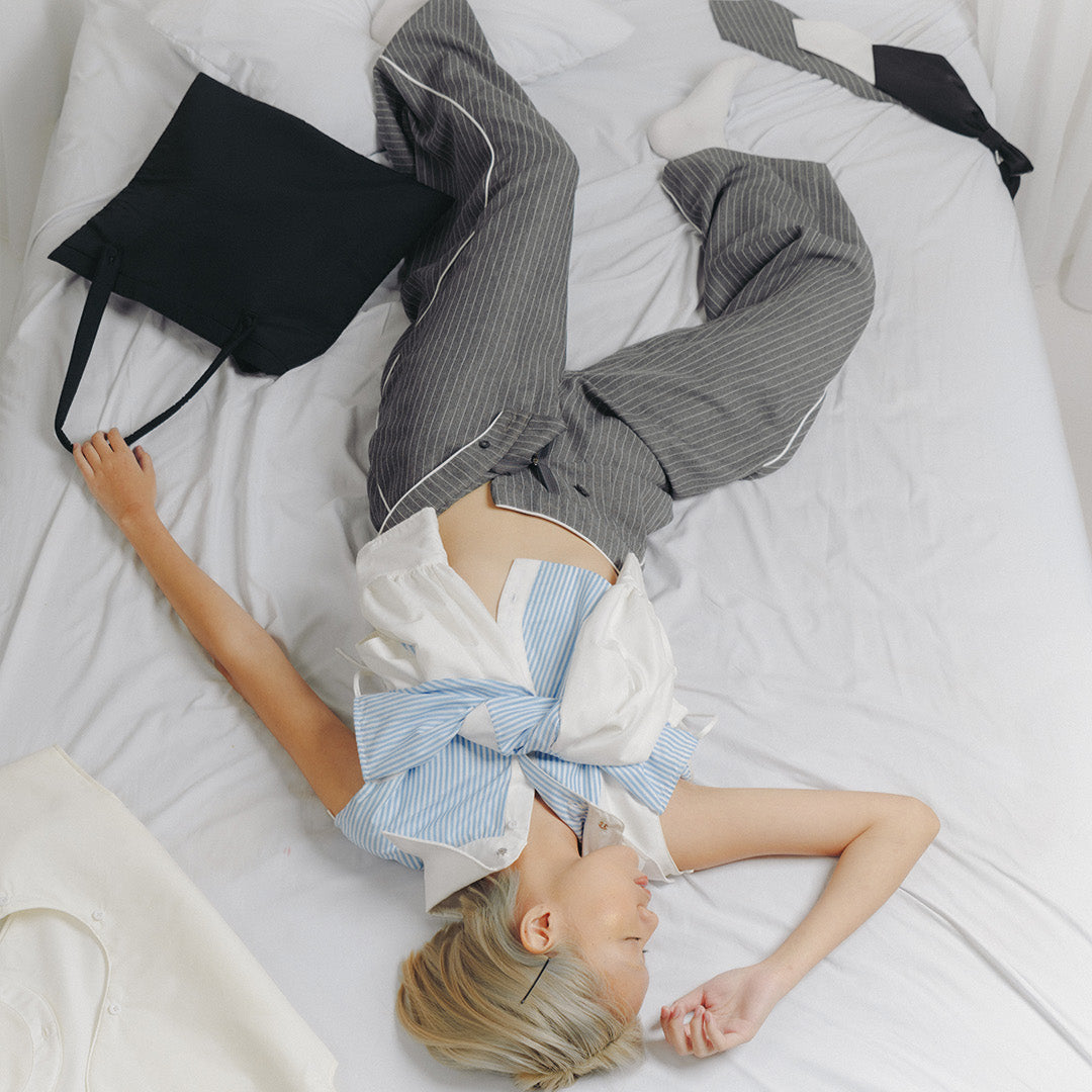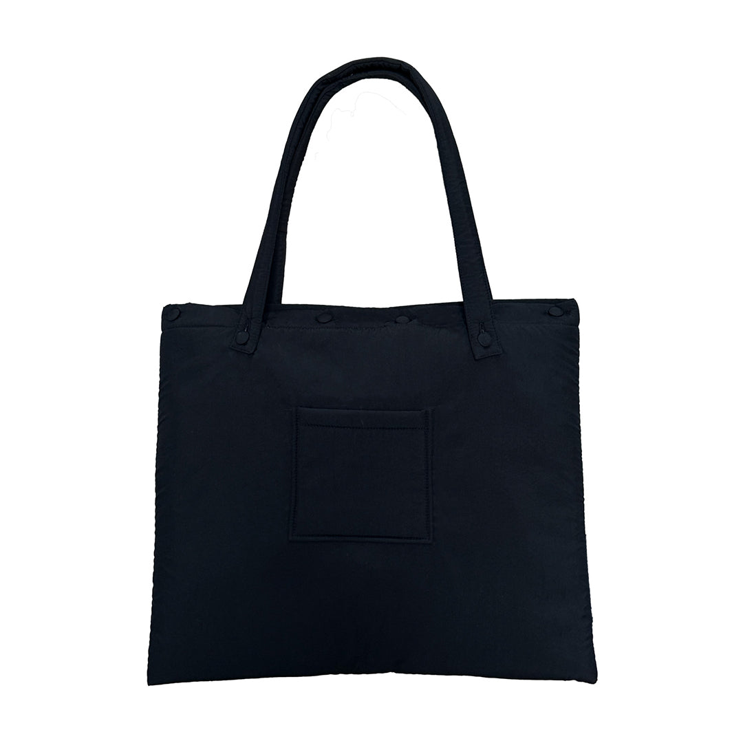The versatile 3-in-1 accessory function as a bucket bag and a tote bag. It features a small pocket and buttons for easy conversion.
