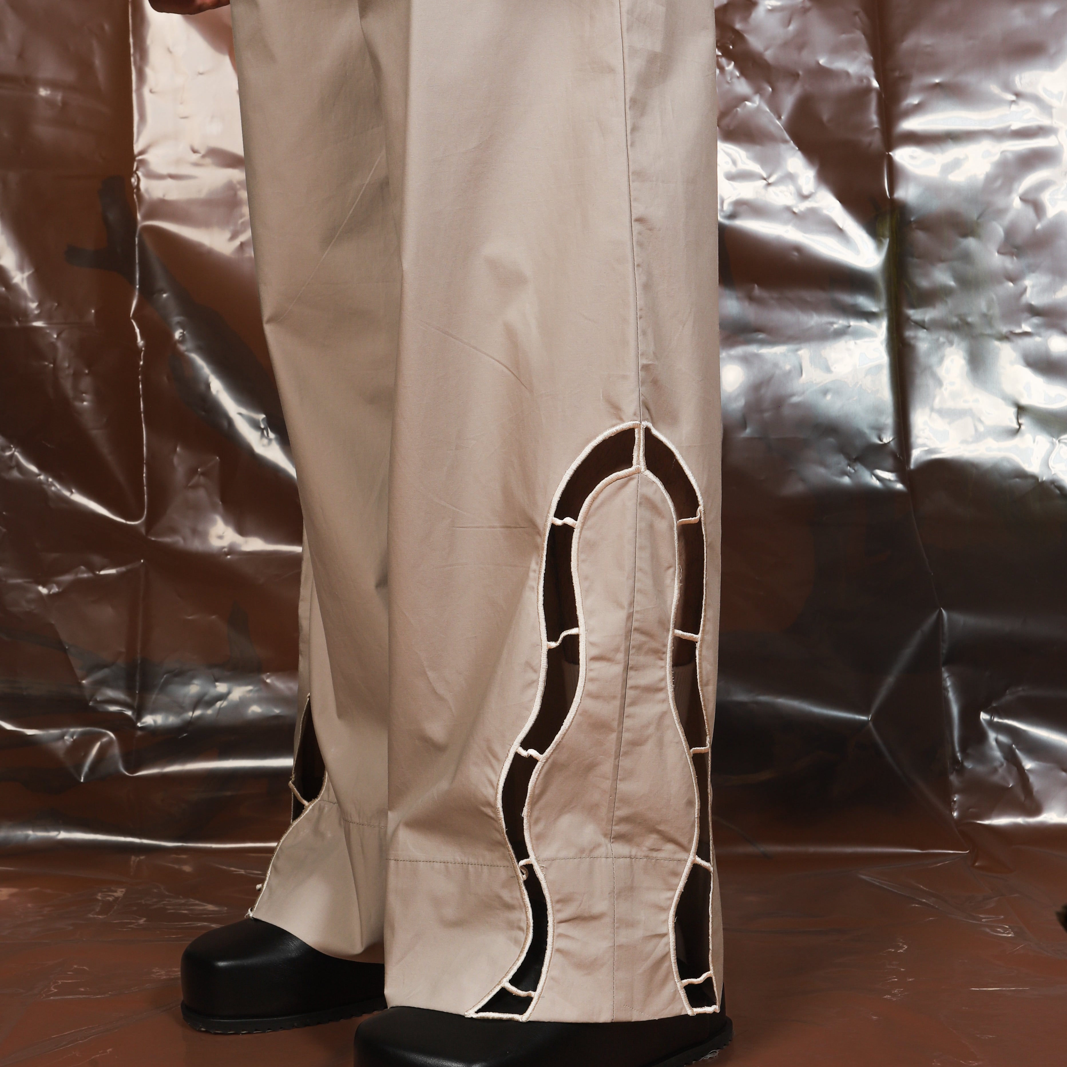 Straight wide pants featuring geometric cutwork embroidery. Side pocket detail. High-hemline detail