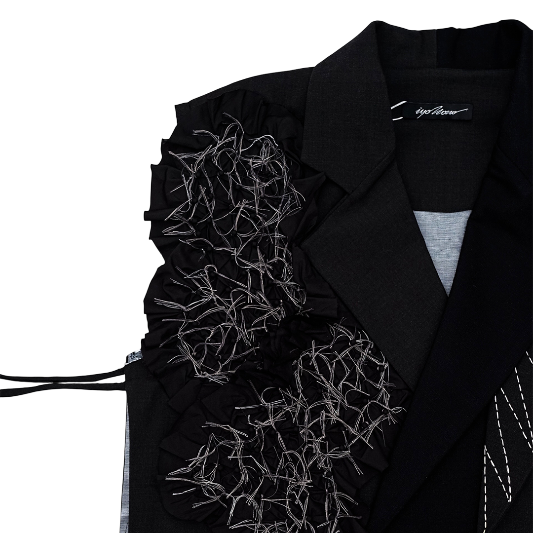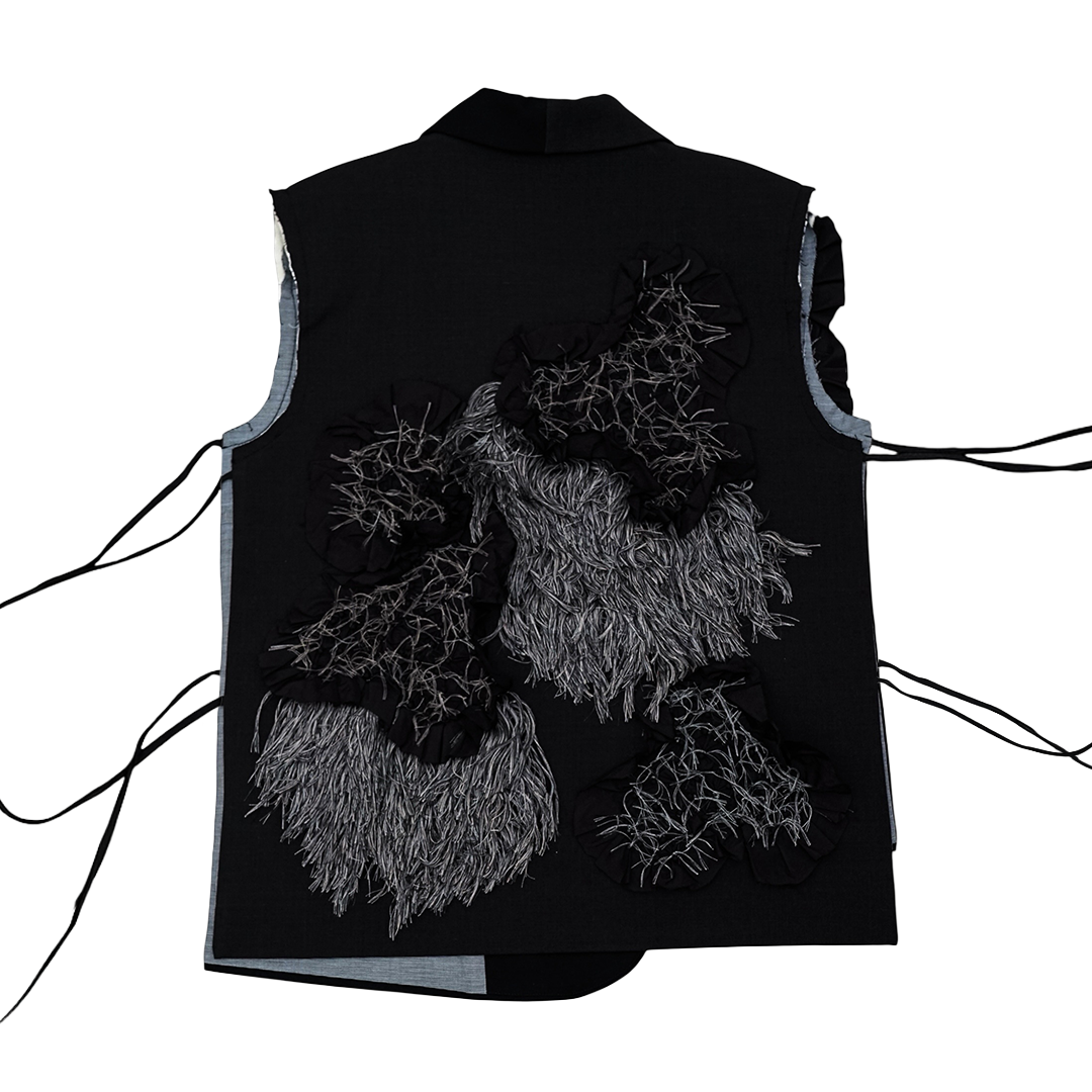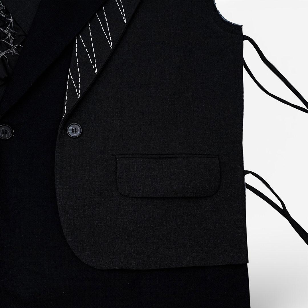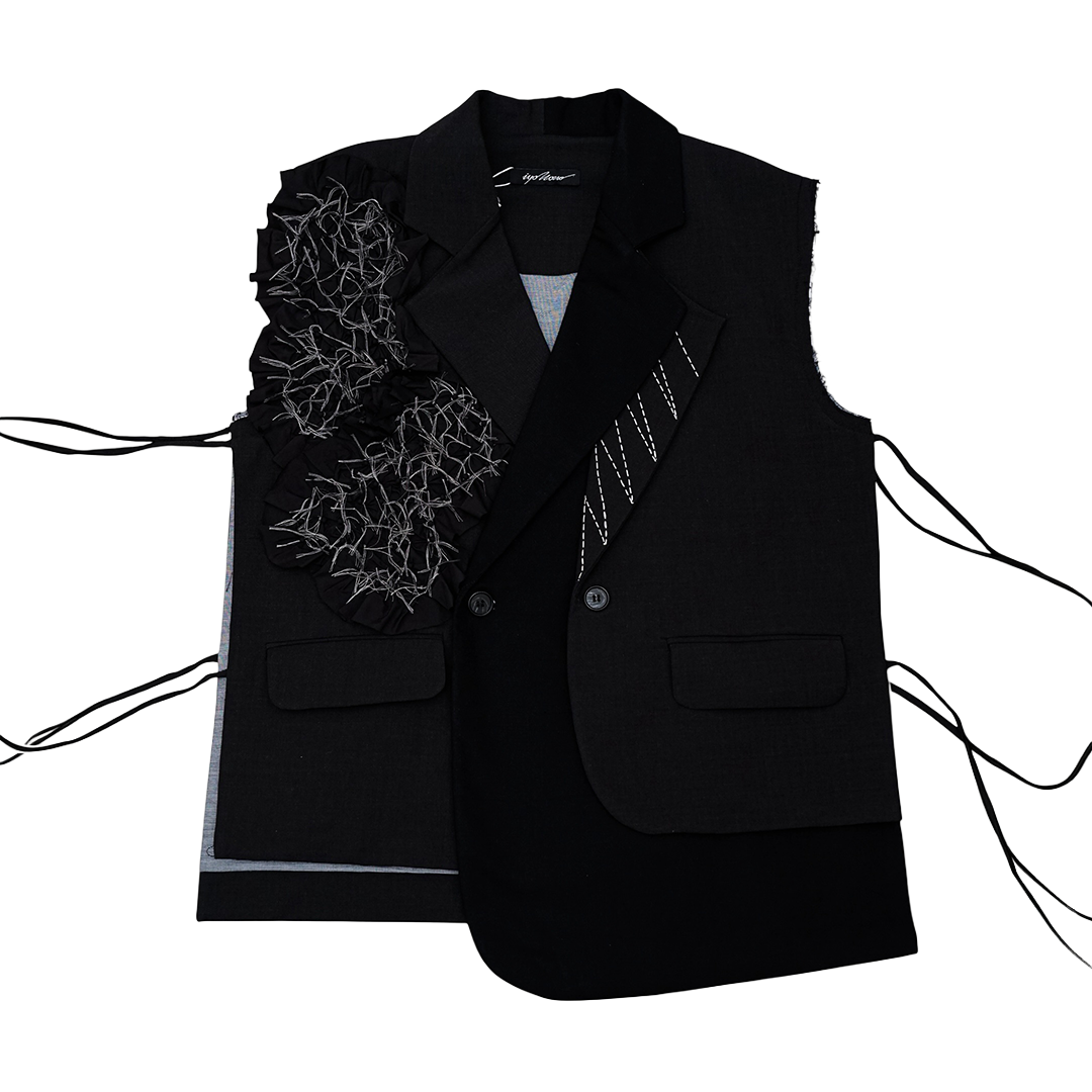Rompi tanpa lengan dengan patch yang tersebar dibagian depan dan belakang. Vest ini dilengkapi saku dibagian depan, Rompi tanpa lengan ini memiliki tali di sisi kanan dan kiri. Kancing dibagian depan dapat dikancingkan. Potongan asimetris pada bagian depan