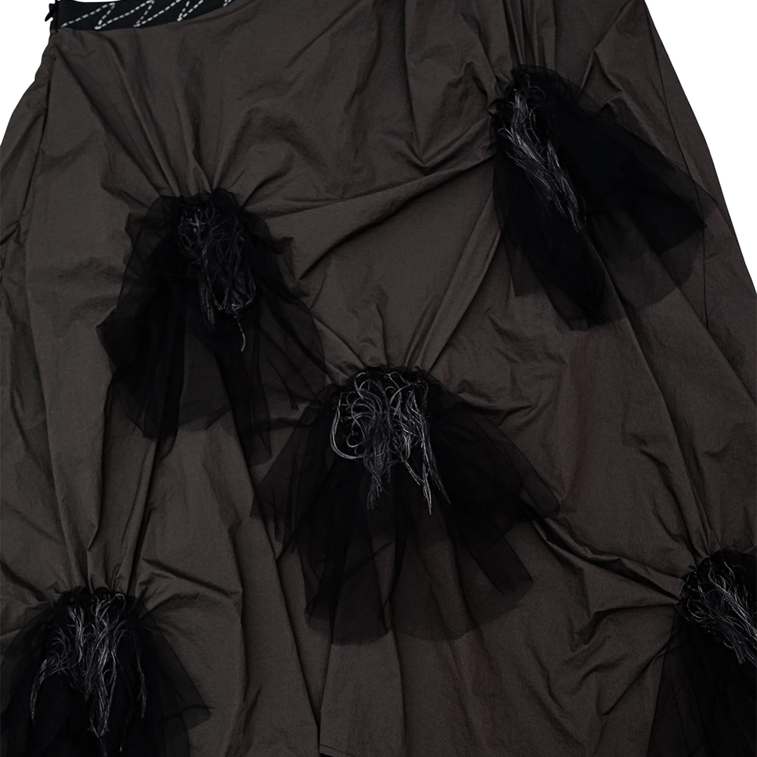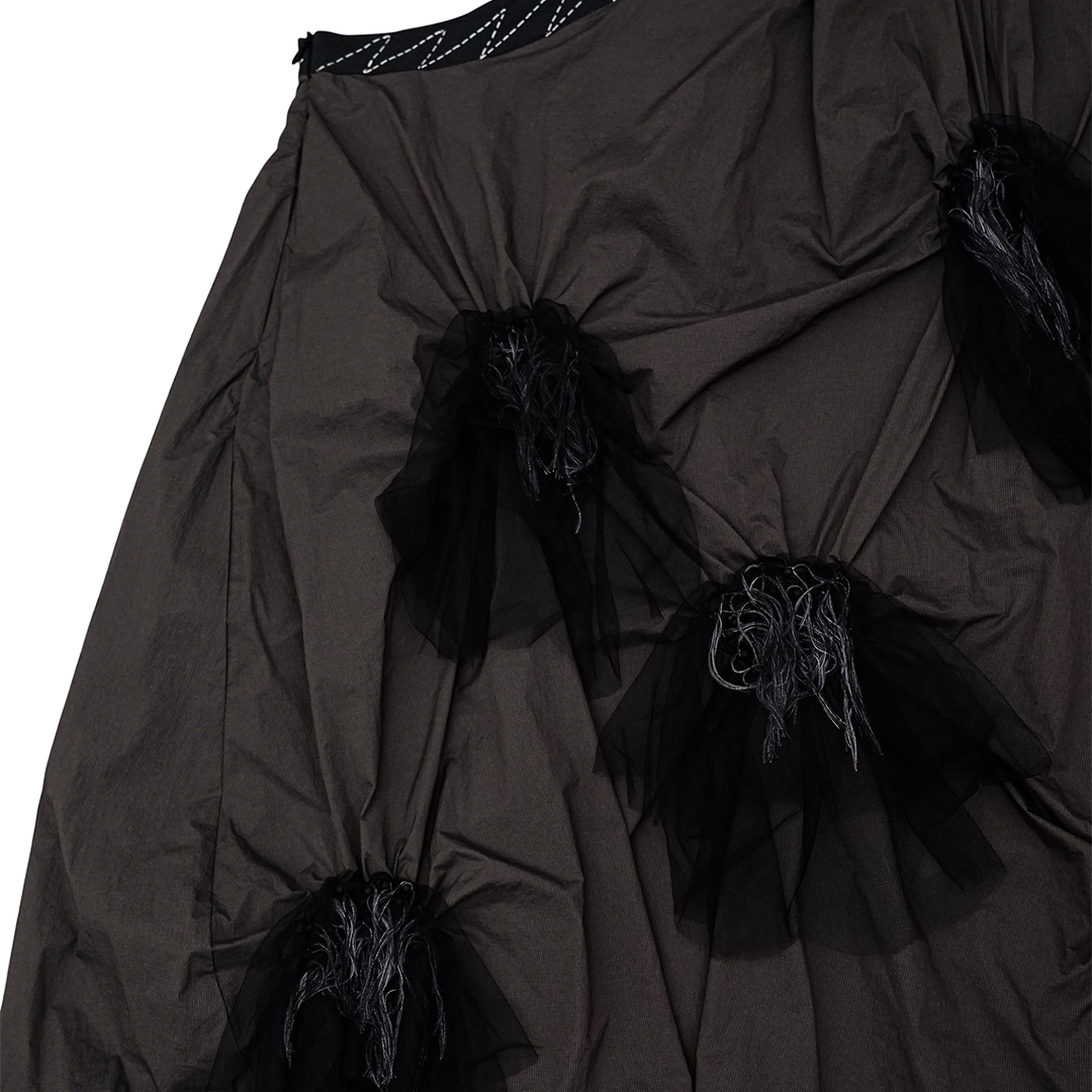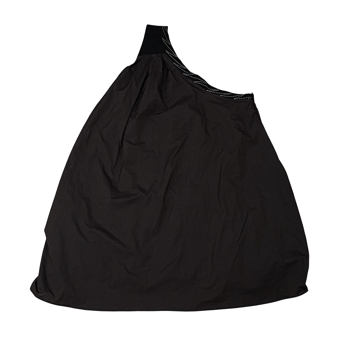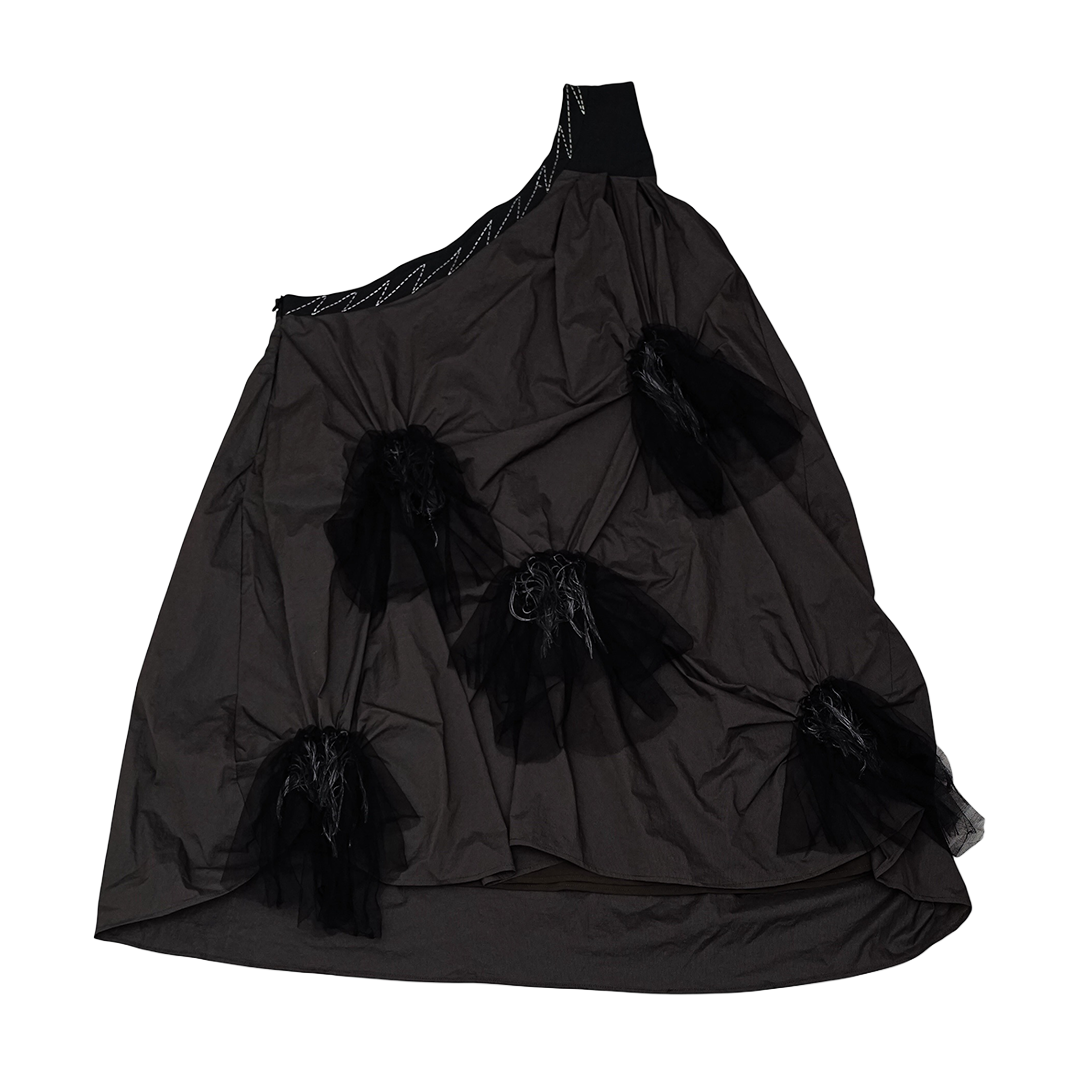 Dress dengan desain asimetris menggunakan satu tali dibagian bahu. Terdapat pacth yang tersebar pada bagian depan.