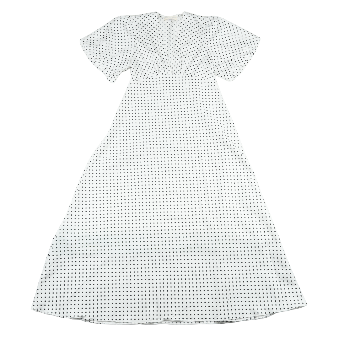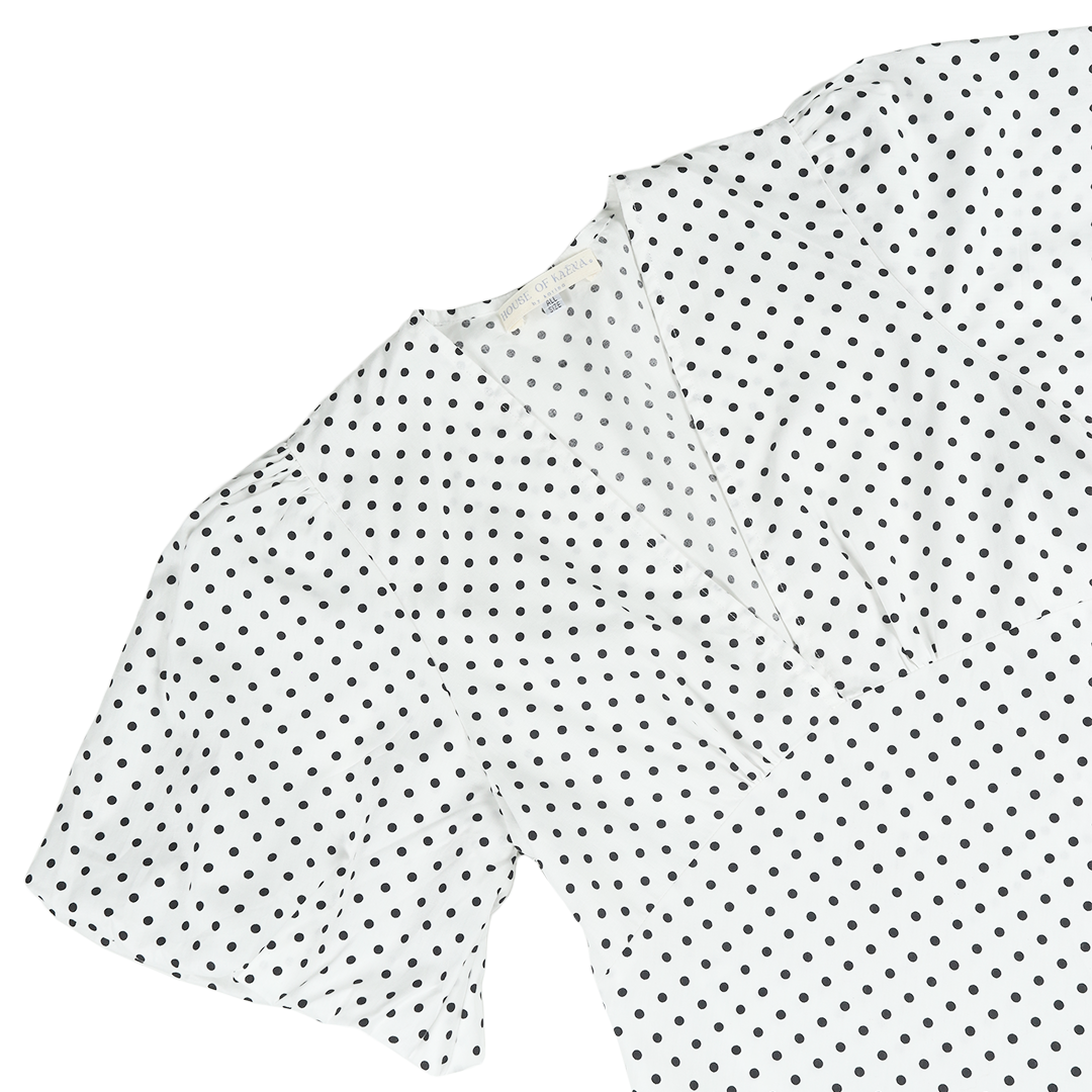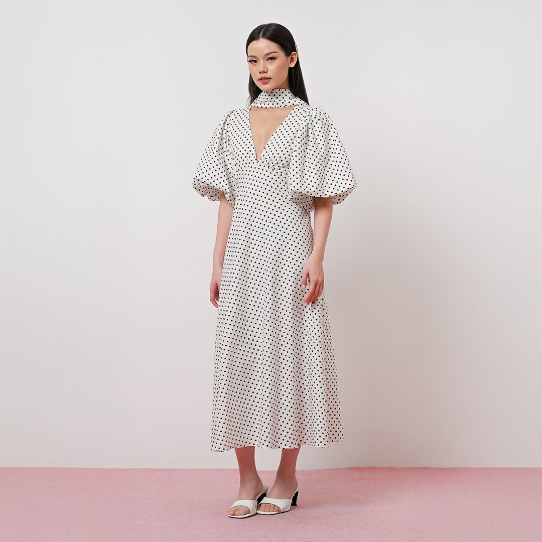 The Dottie Dress features a chic polka-dot pattern, an alluring V-neckline, a soft shawl detail, and a beautiful fluid drape. Finished with puffy balloon sleeves. Fabric is 100% Japanese cotton