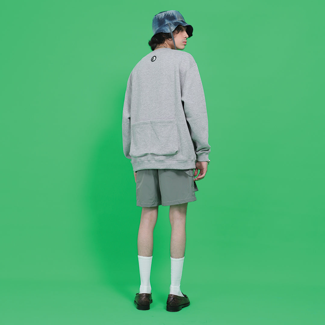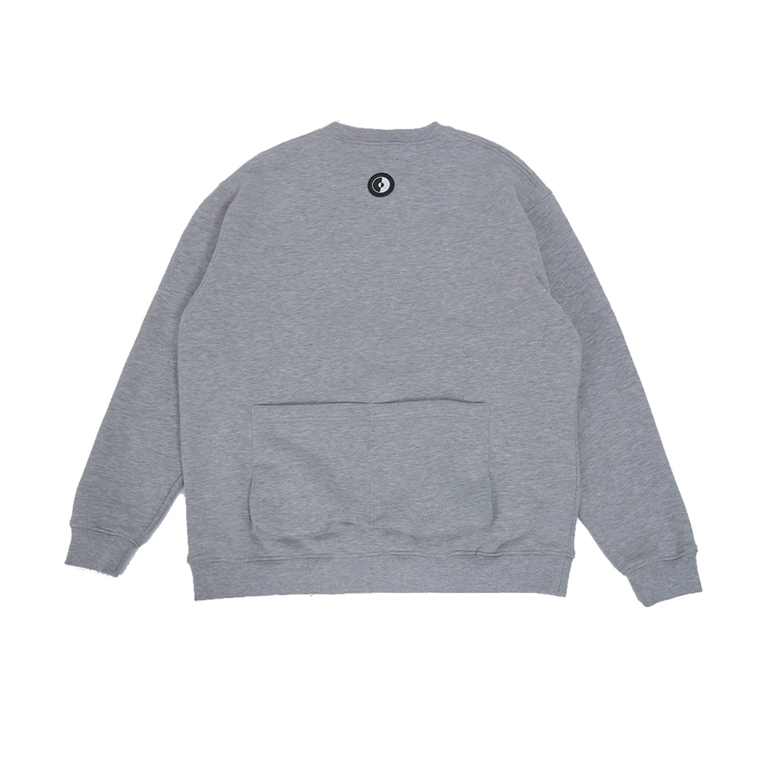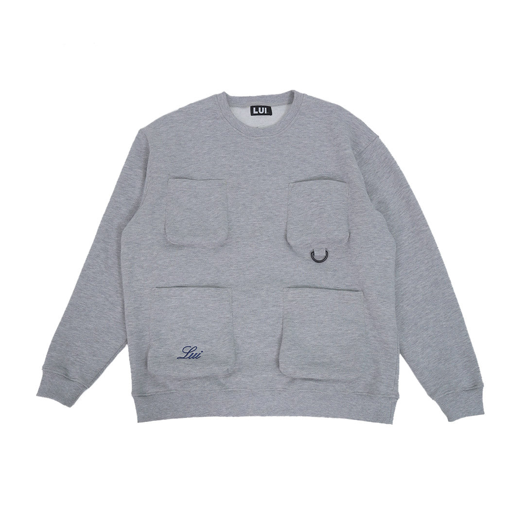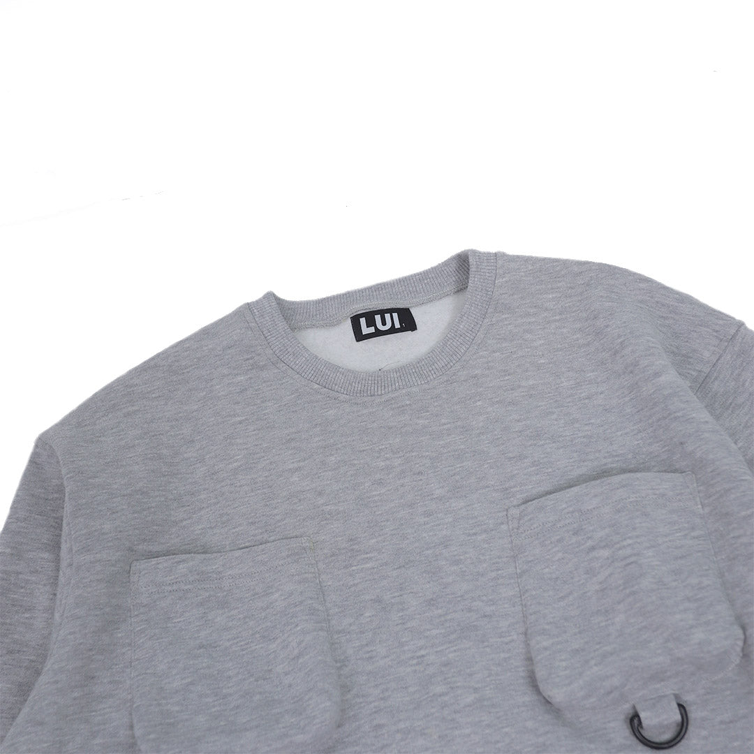 Oversized fit sweatshirt in heather grey with multiple front and back pockets, with d-ring hardware at chest.