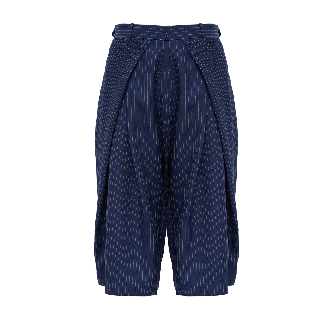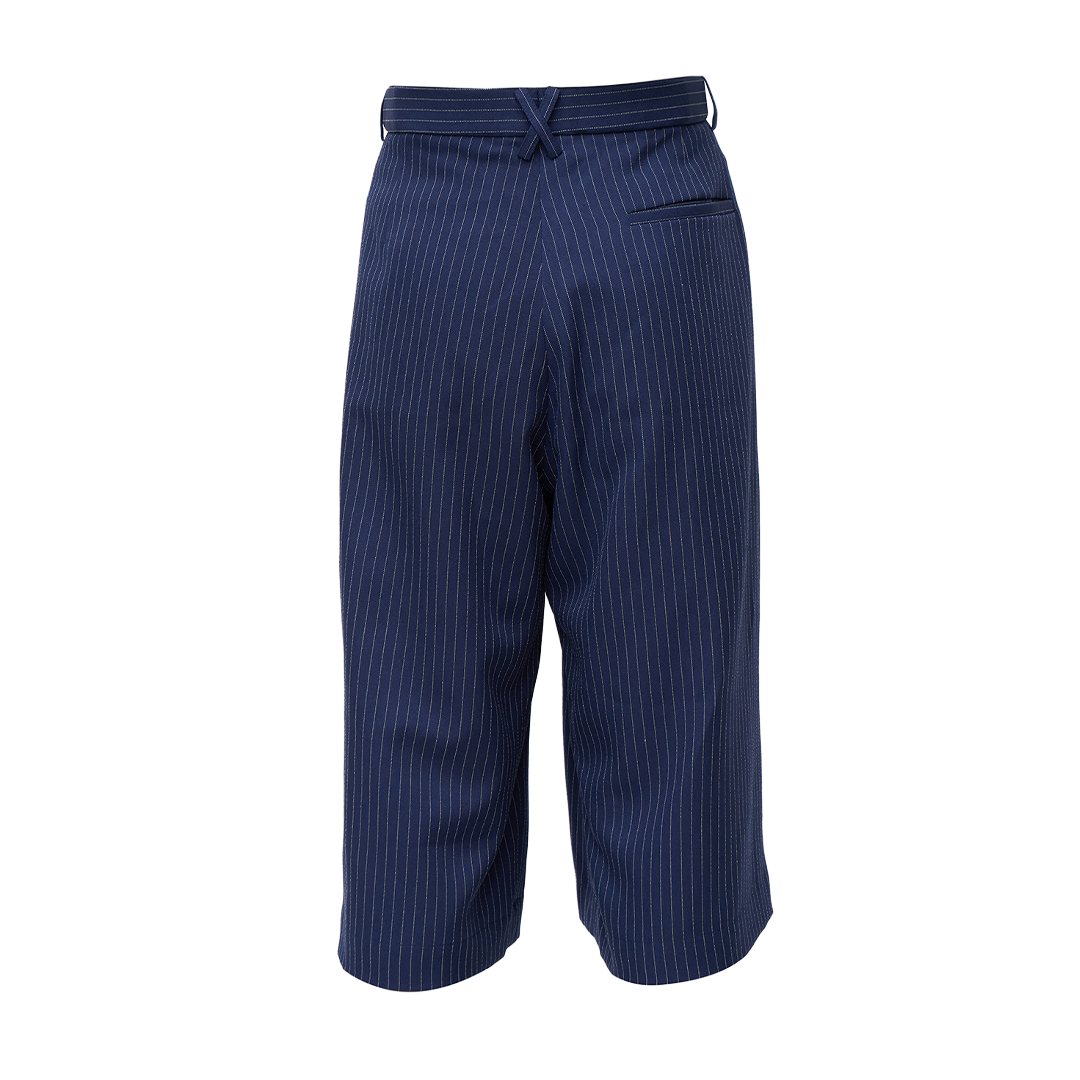 The Sans Culotte Pants are cut in a below-the-knee length with a subtle flared silhouette, offering ease of movement and a refined drape. Crafted in pinstripe fabric, the design combines tailored detailing with fluid volume for a composed yet distinctive look. A modern reinterpretation of classic culotte proportions, ideal for structured yet effortless styling.