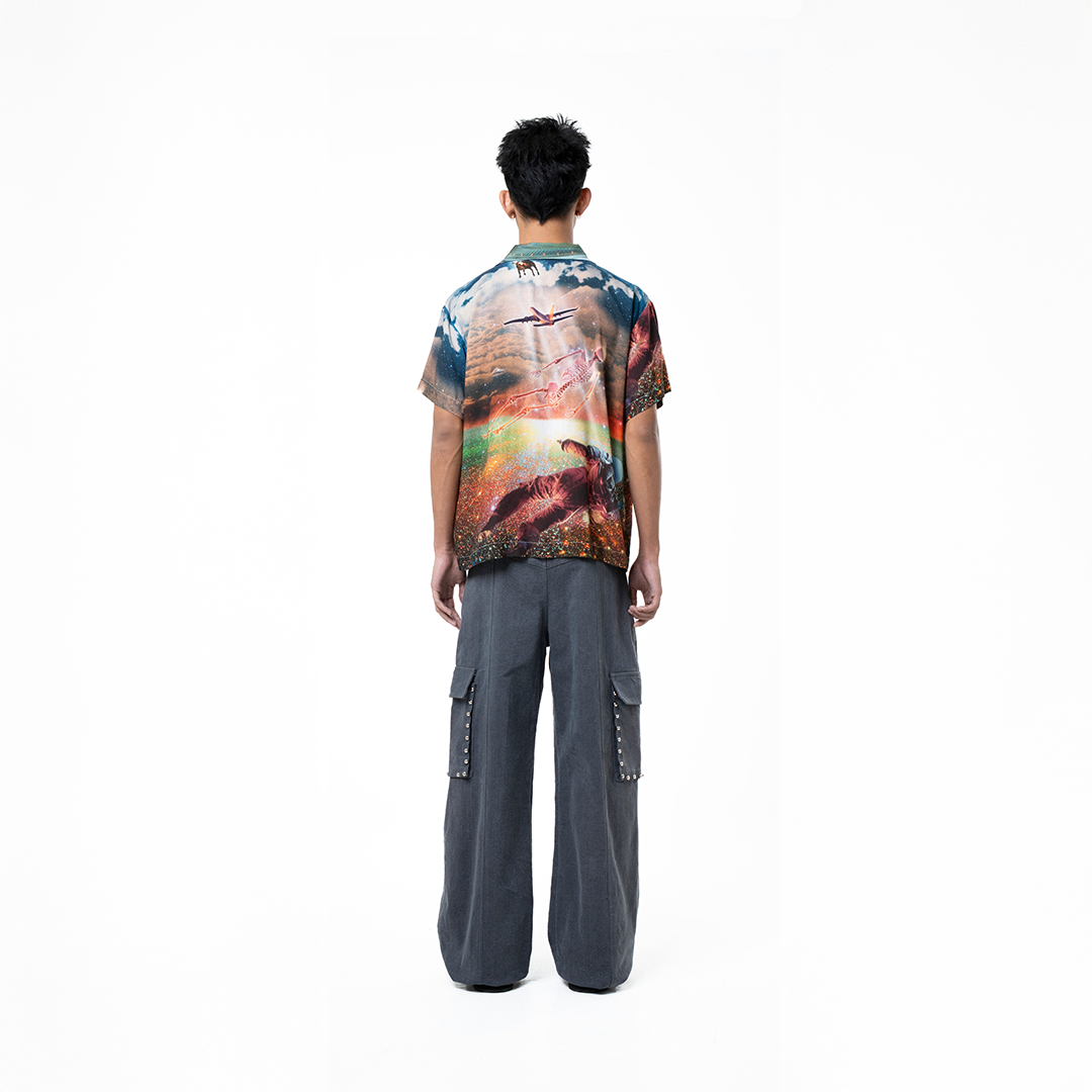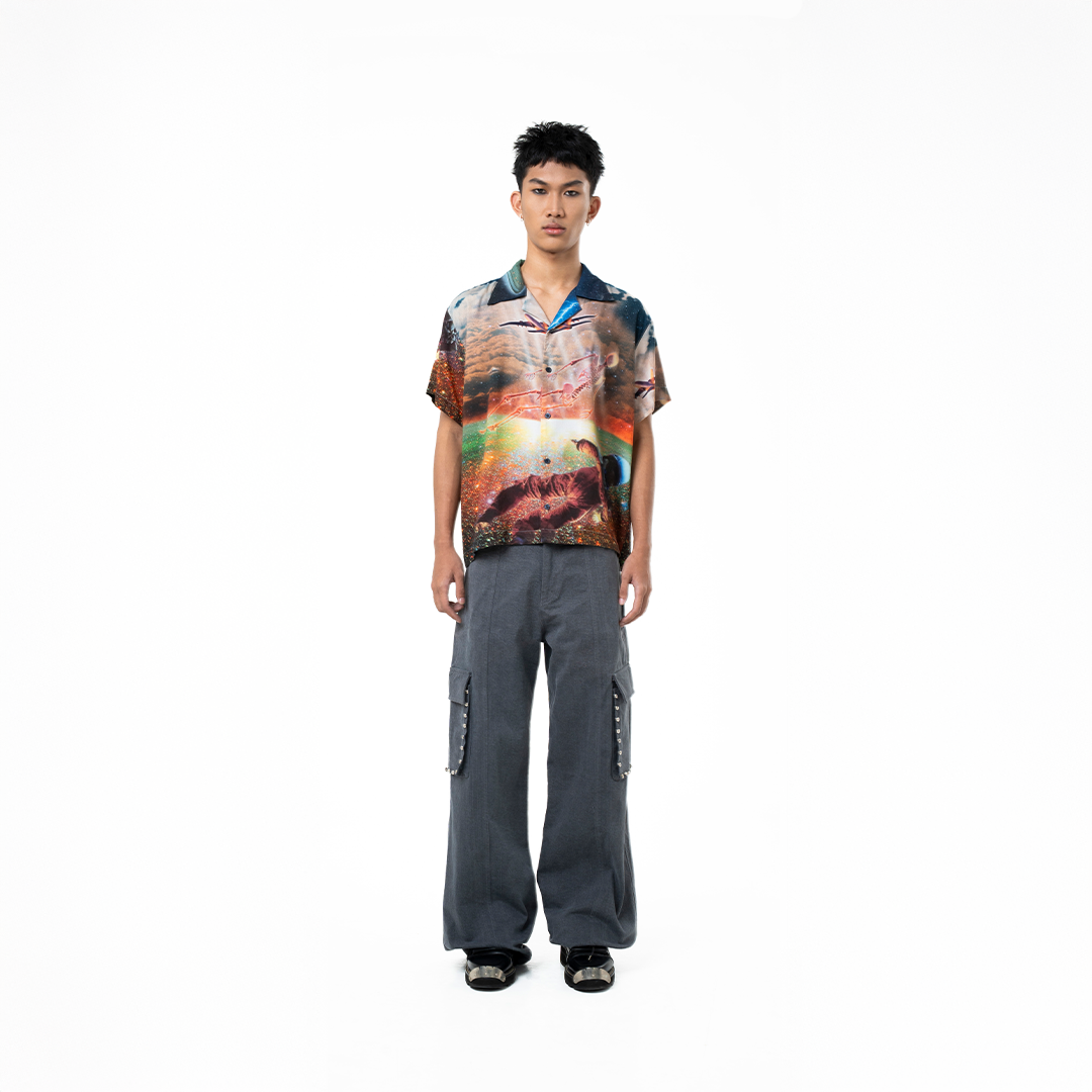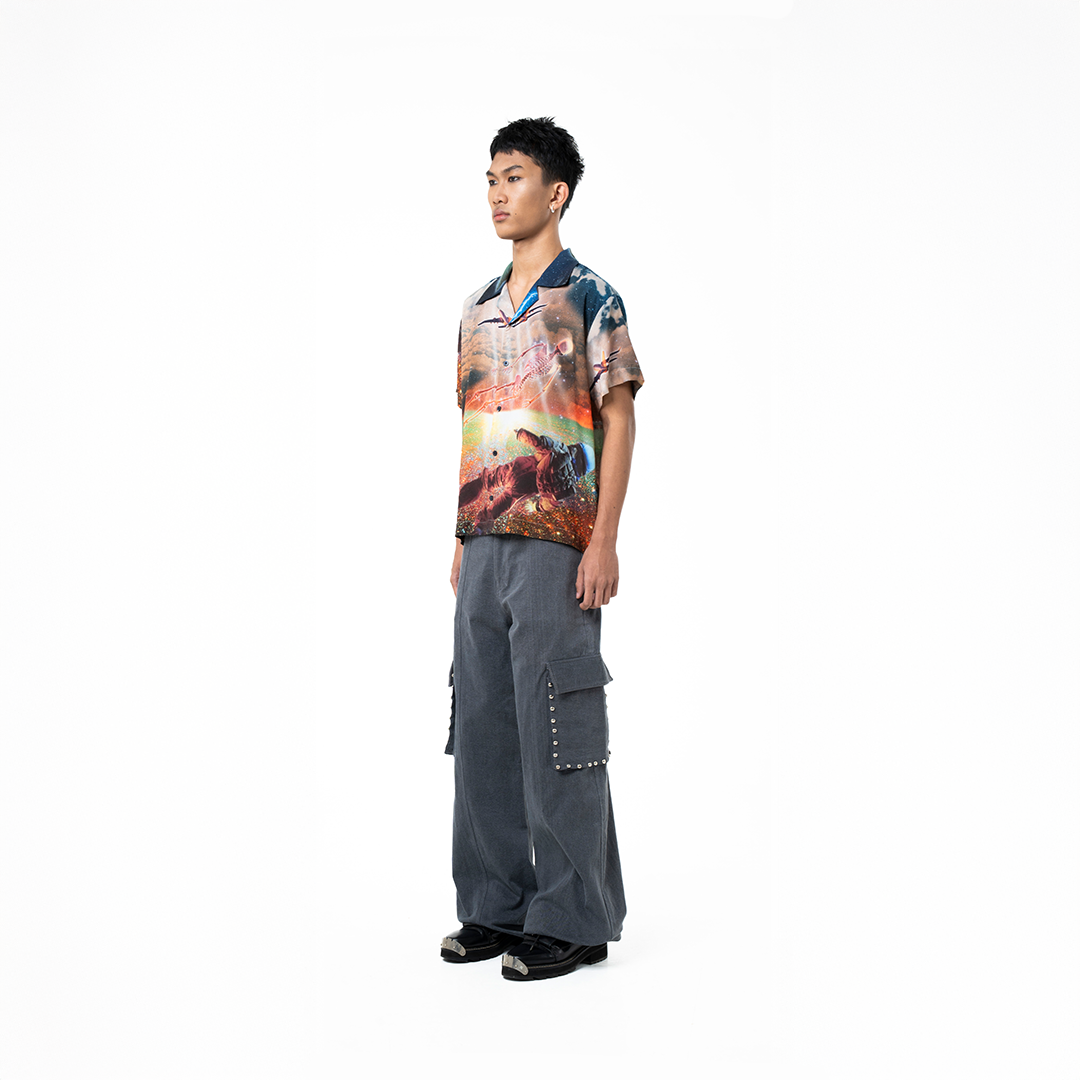 Printed cotton rayon blend short sleeve shirt with all-over print