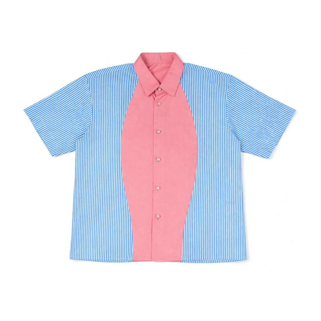 This short-sleeve shirt is made from lightweight cotton with a smooth, crisp texture. The base of the shirt uses blue-and-white vertical striped panels on both sides and sleeves, giving it a classic shirting look. The center front is made from a solid pink panel that extends from the collar to the hem, creating a strong symmetrical contrast.