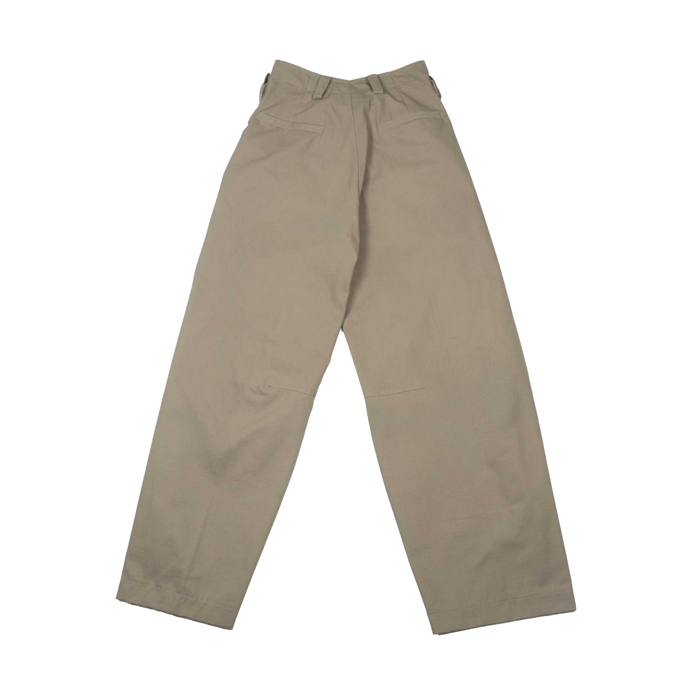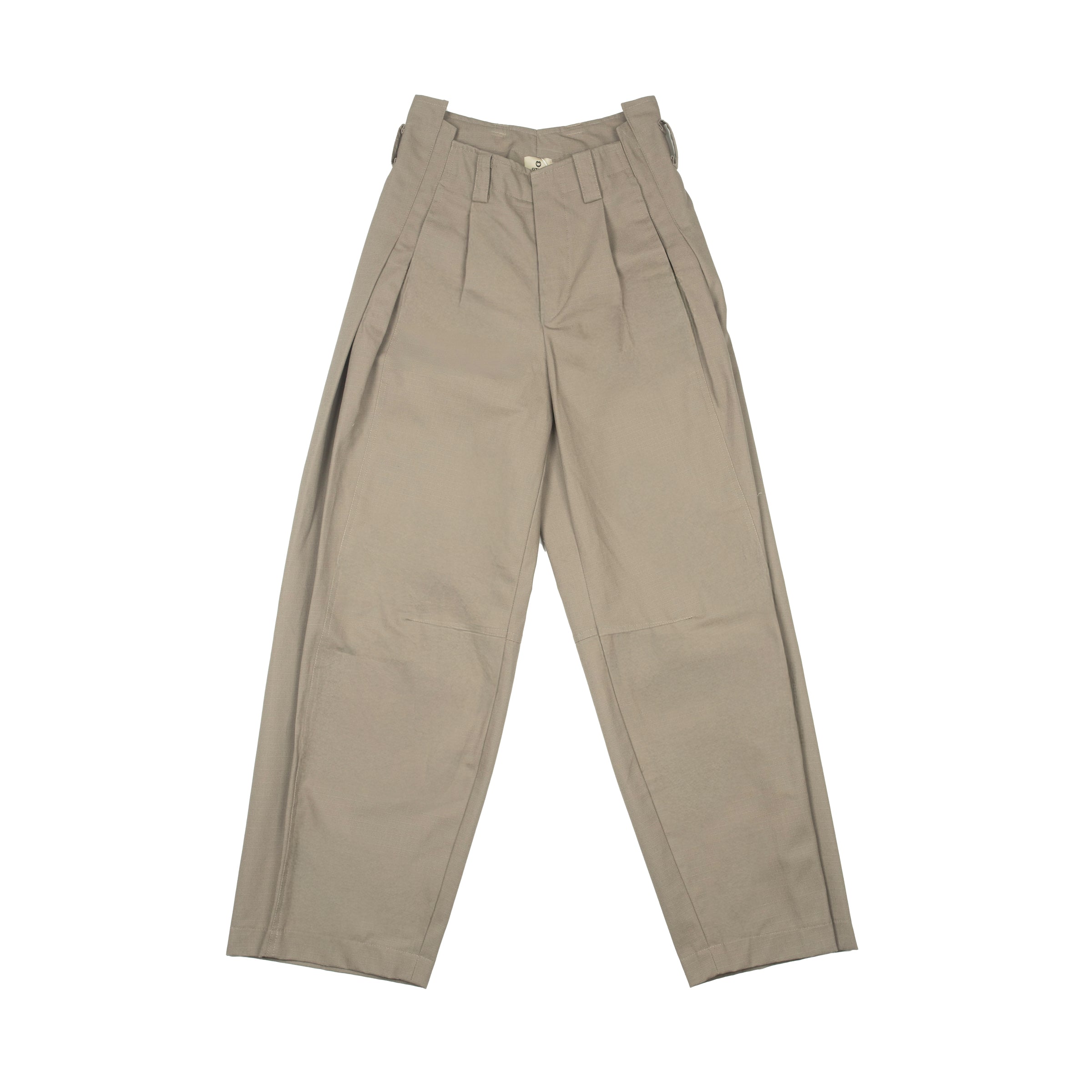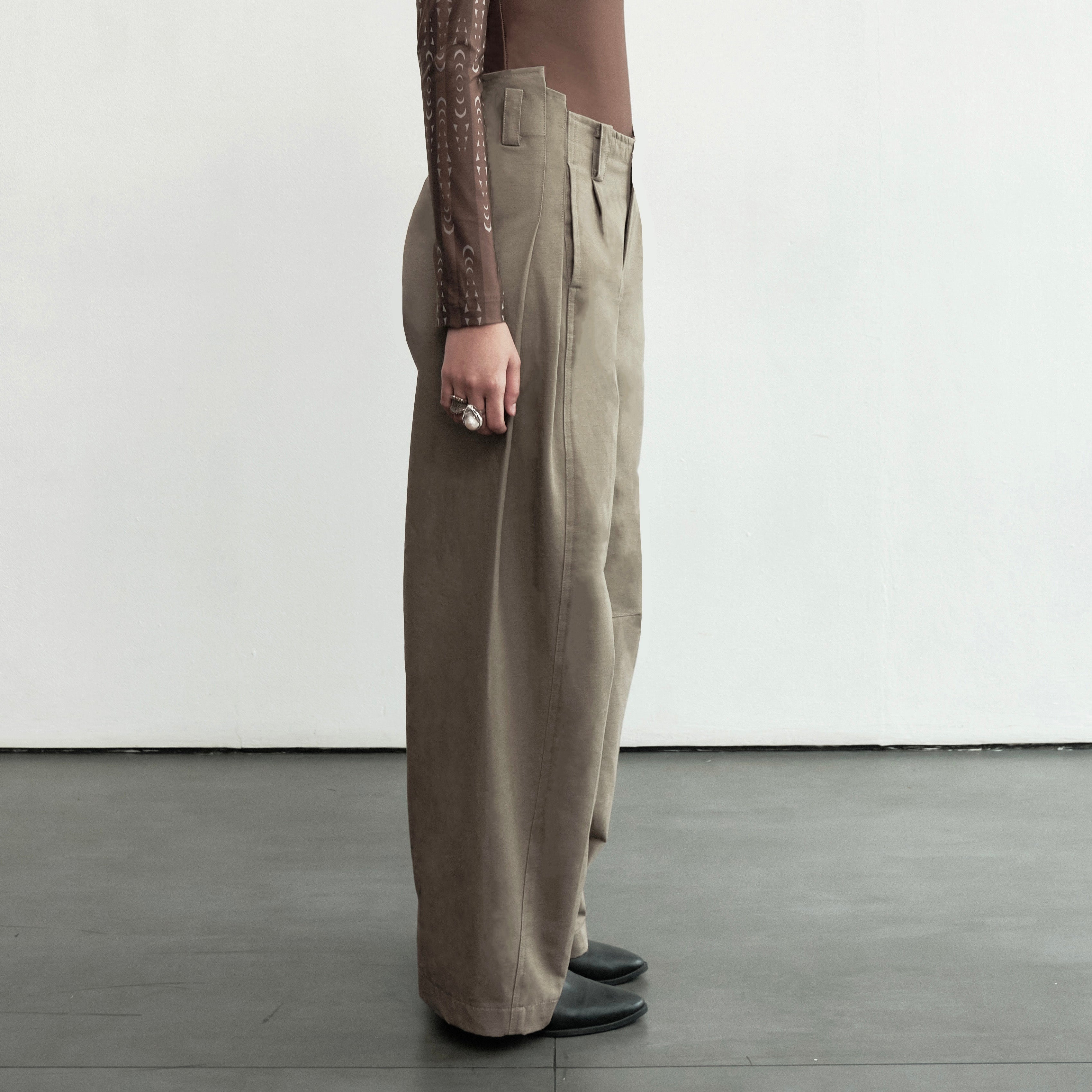 A curve-leg trousers. has stacked uneven waistband, it is inspired by architectural building, has two slant pockets on the front, and two patch pockets on the back.