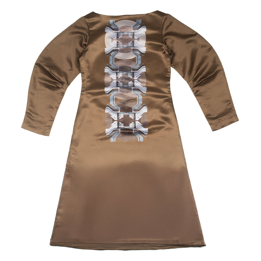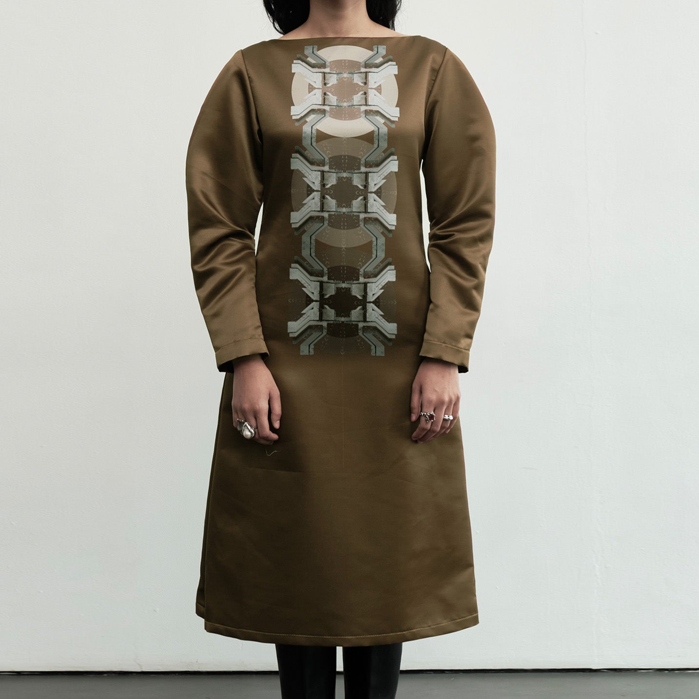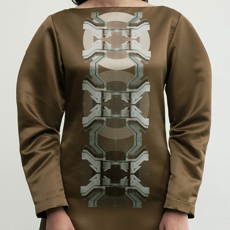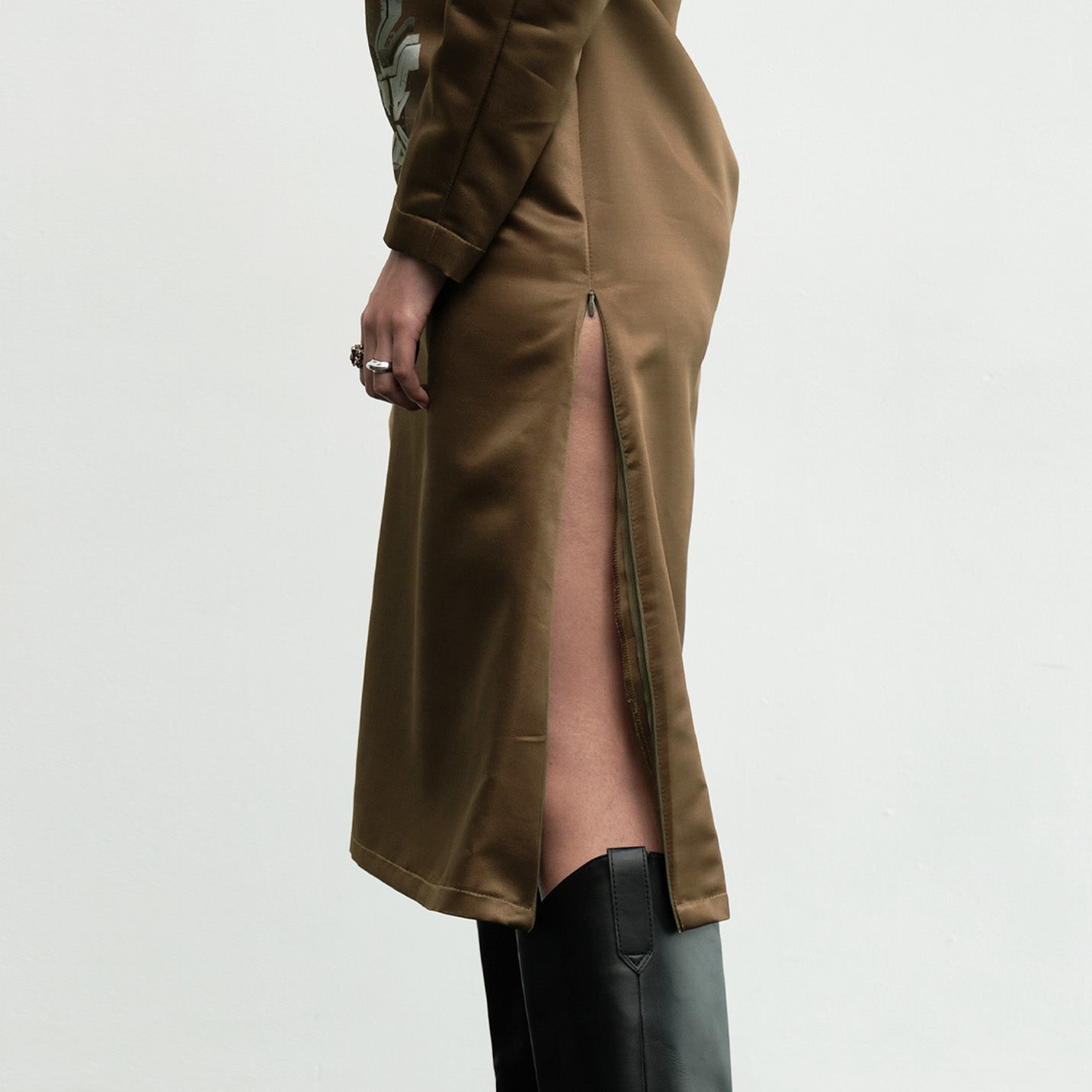 Defined A-lined dress that also has two sidedslit with invisible sipper at the bottom. has a printed detail that inspired from triplet of tables. The structured shar\pe will refine the body posture.