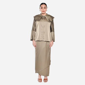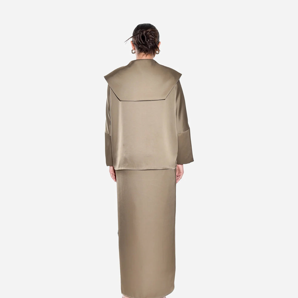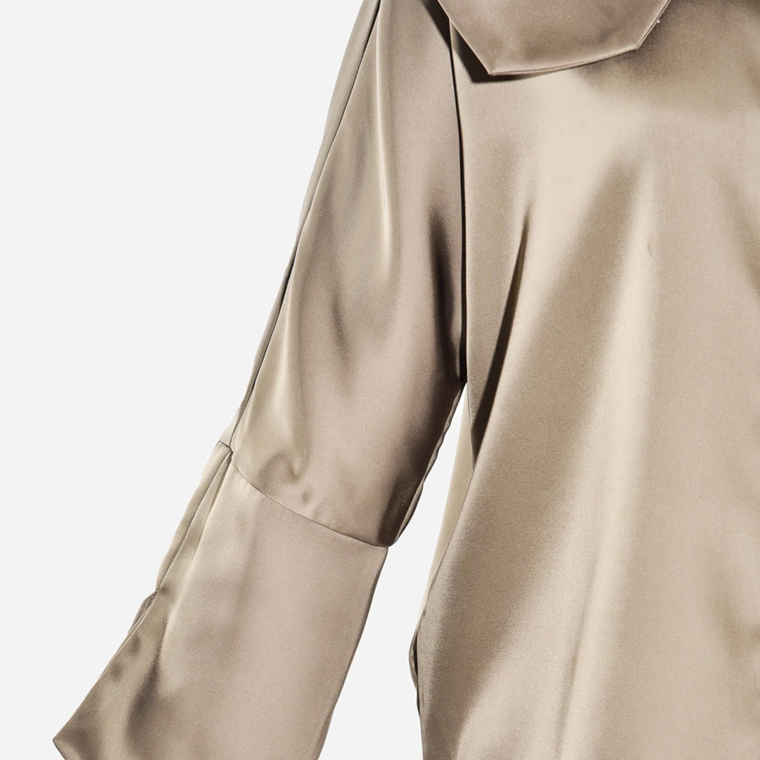 Introducing a bold take on everyday sophistication, this top features a striking oversized collar that elevates its minimalist silhouette. Crafted in a smooth, satin-like fabric, it offers a touch of luxury with a modern edge. The relaxed fit and unique collar detail make it a versatile piece, perfect for pairing with tailored trousers or your favorite jeans for a sleek, effortless look. Ideal for those who love to make a statement with subtle yet impactful style choices.