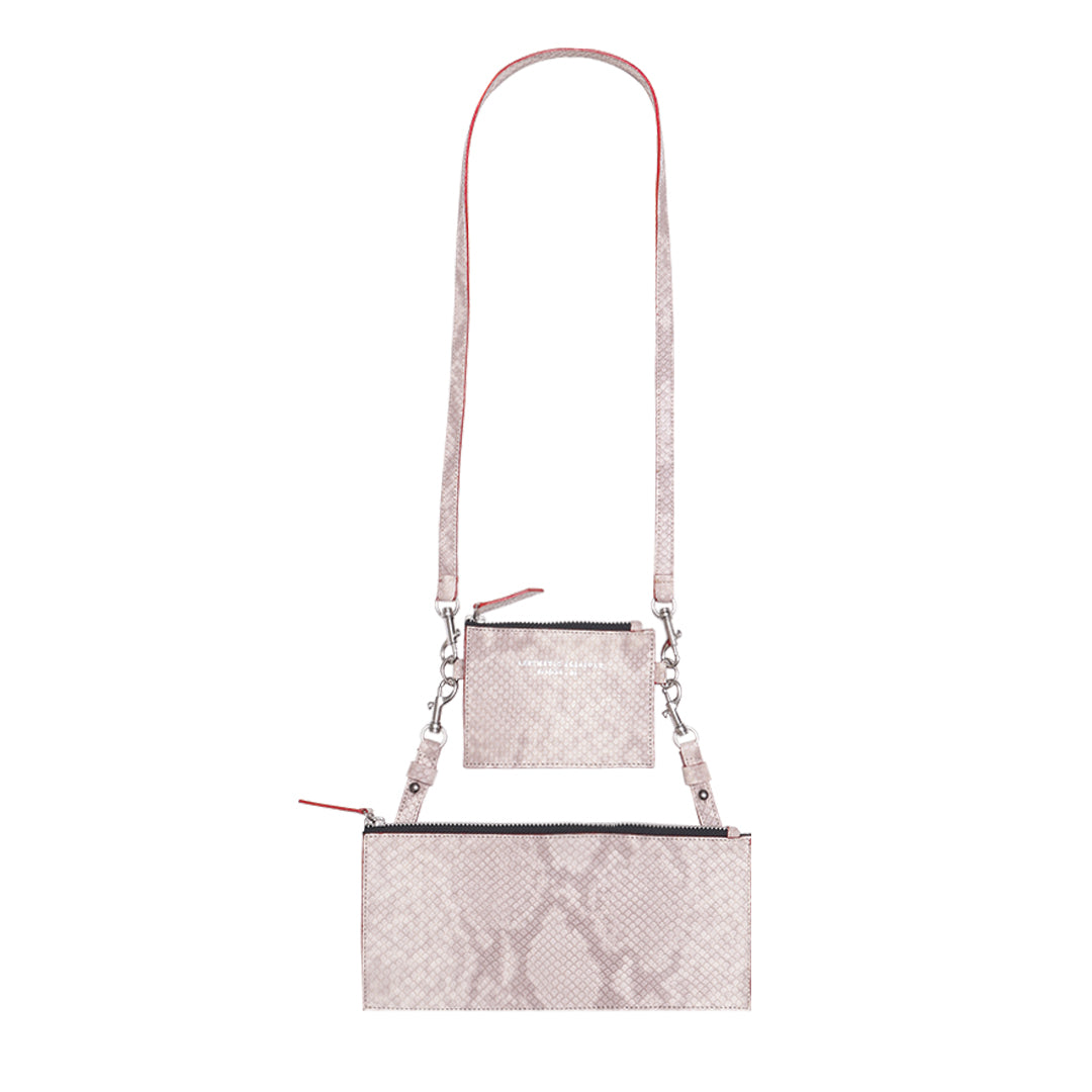 Multilevel wallets with detachable strap. The long wallet can fit to a cellphone. The small one is card holder or coin pouch with zipper closure. Three card slots at back. In snakeskin texture.