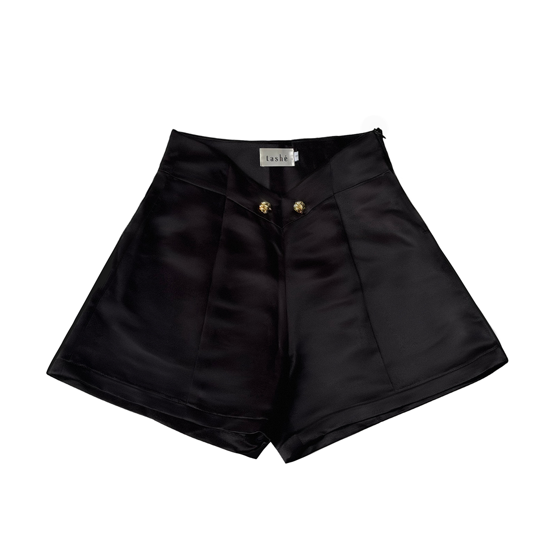 A high waist tailored shorts with collar waistband and button embellishments featuring an A line silhouette