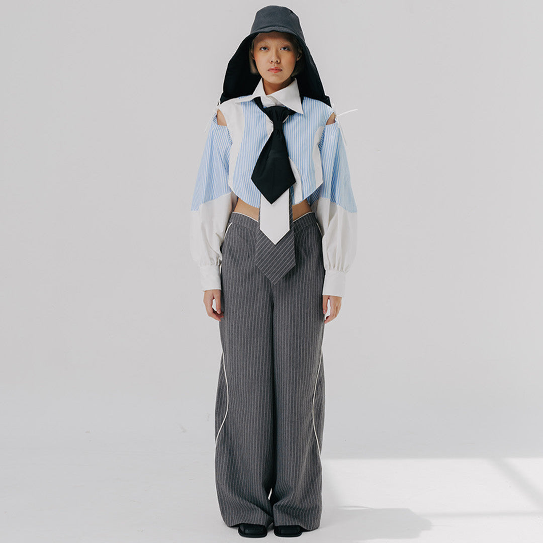 Asymmetrical layered tie in contrast fabrics with black semi wool, white and blue pinstripes cotton. The tie neckpiece can be worn as a belt.