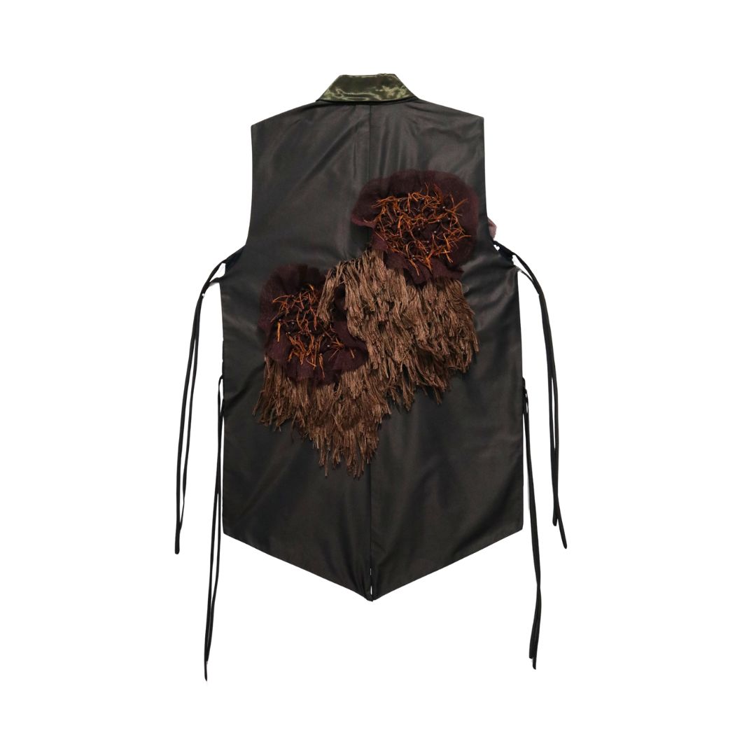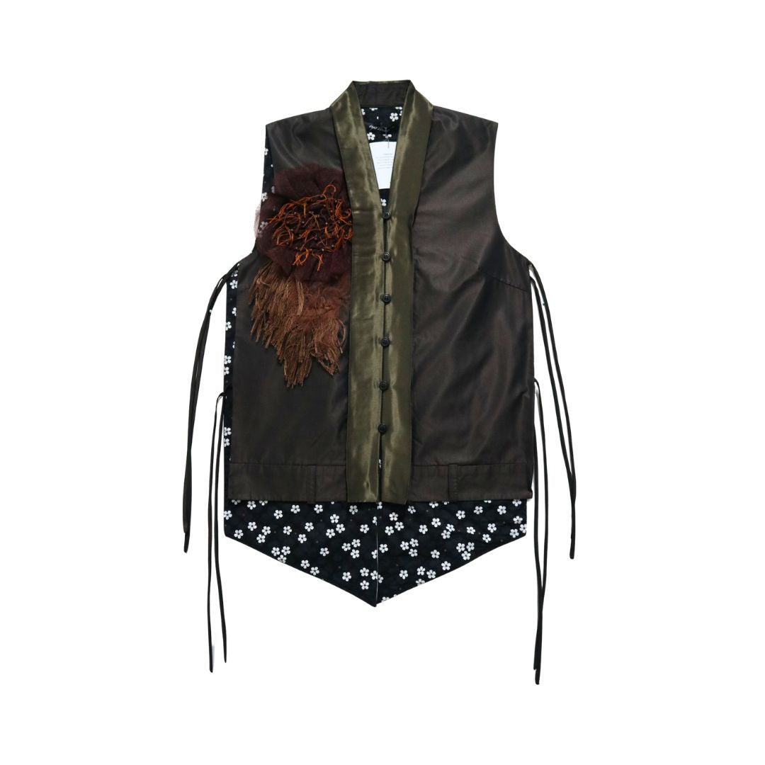 Vest hijau army pendek dengan bahan berkilau, detail kerah kebaya kartini, dengan modifikasi kancing di bagian depan. Bagian samping dilengkapi tali panjang untuk pengikat. Dihiasi handmade fabric patches berwarna coklat khas Iyonono. aksen loop di bagian bawah depan sebagai detail, menciptakan kesan yang unik