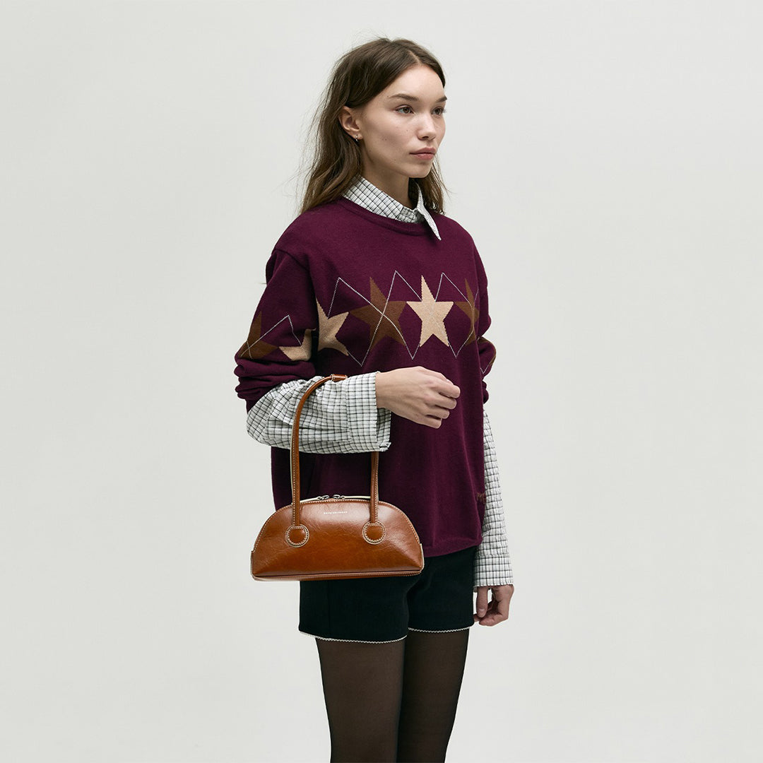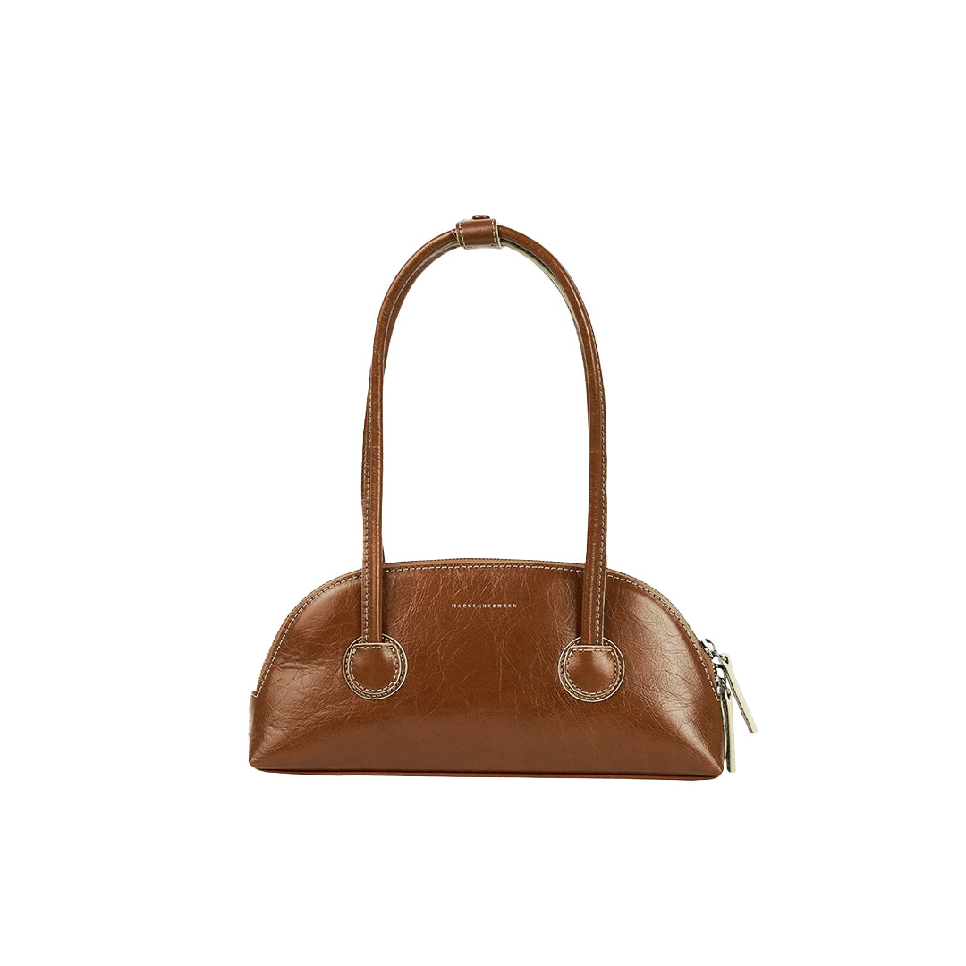 The Margesherwood Bessette Shoulder Bag in brown crinkle leather features a 90s-inspired half-moon shape and a compact, stylish design that’s perfect for everyday wear. Made from genuine leather, it includes the Margesherwood logo on the front, a branded lining, and a shoulder strap.