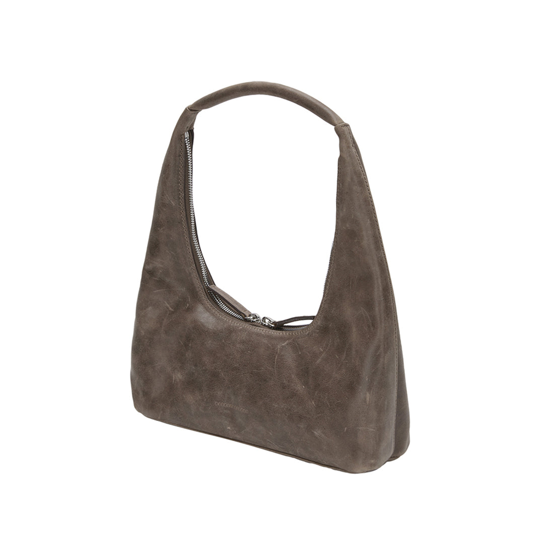 The Margesherwood Hobo Shoulder in Washed Brown Pull-Up leather featuring a round top handle, with the brand logo on the front and logo lining inside. The interior includes a convenient slip pocket.