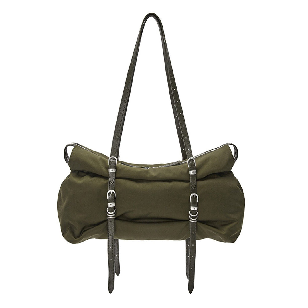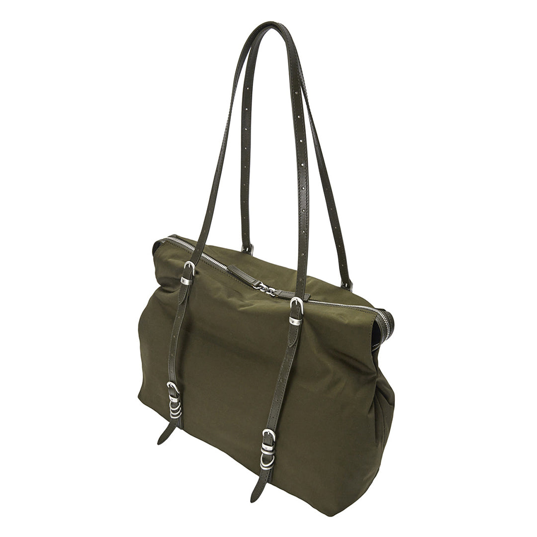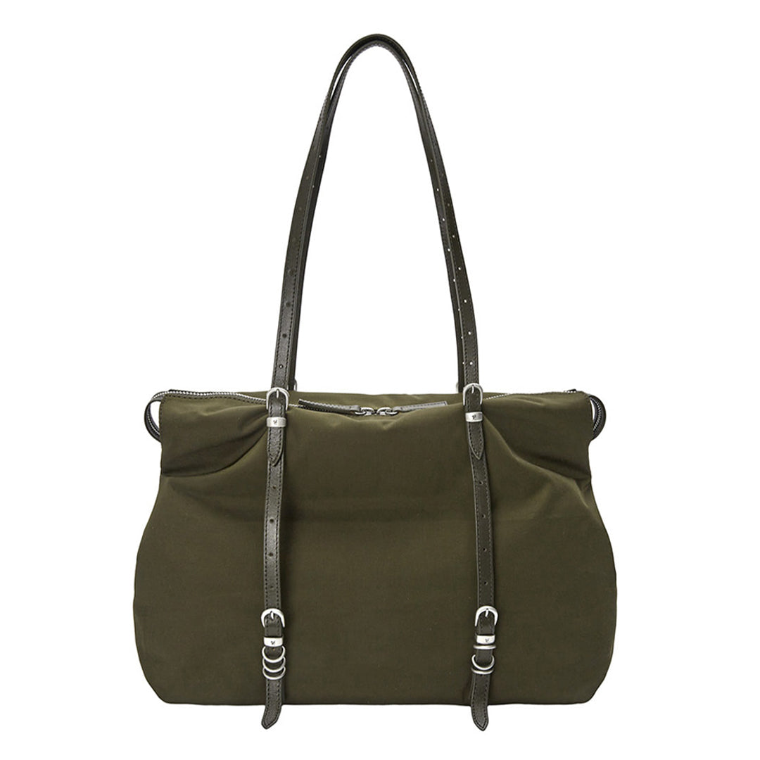The Margesherwood Overpacker in Khaki featuring a shoulder strap body and mini-sized metal buckles, this bag allows for effortless transformation by adjusting the upper or lower buckles to suit your needs. The adjustable shoulder strap includes a Margesherwood logo-engraved metal keeper loop. Inside, a zip-fastening pocket and brand logo lining,