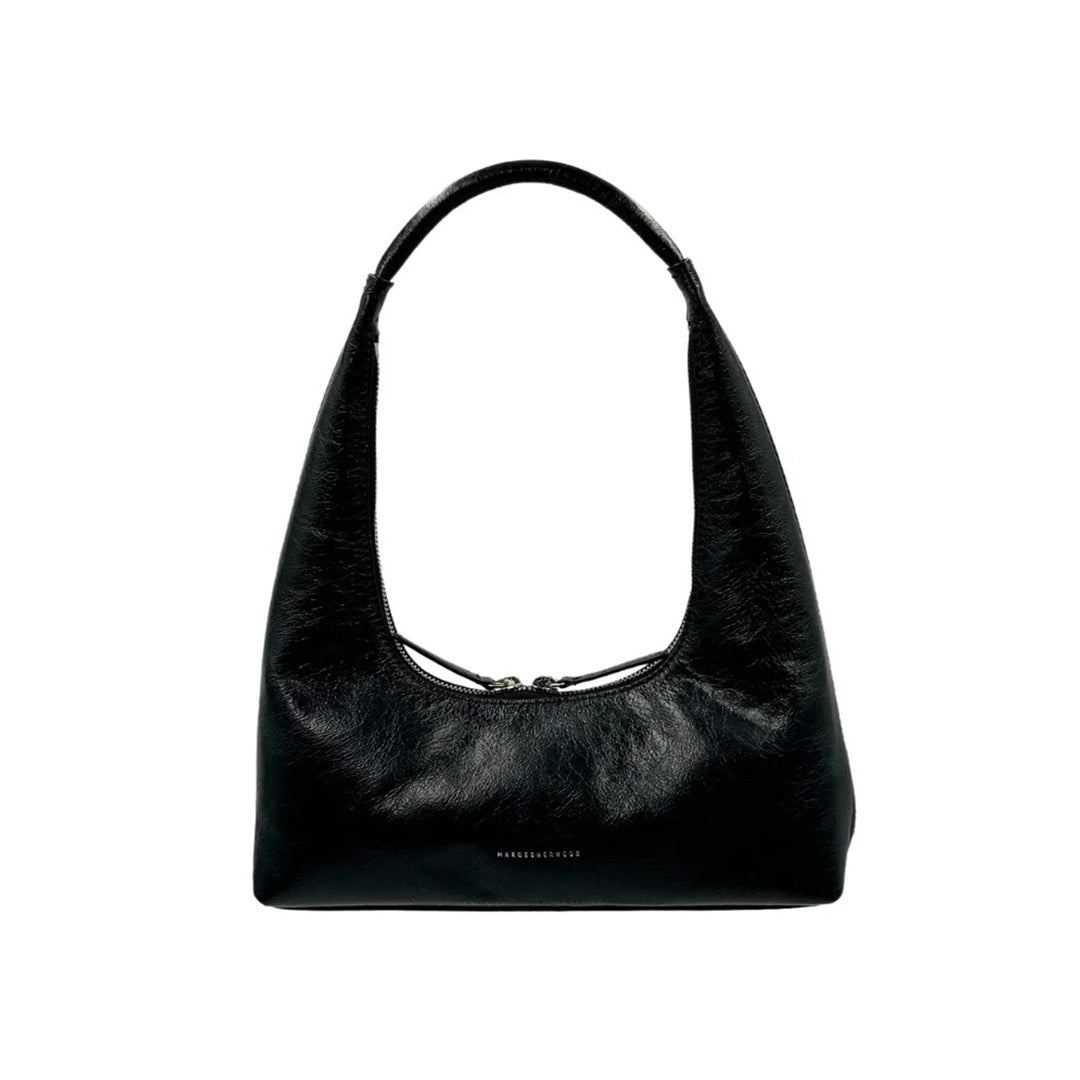 The Margesherwood Hobo Shoulder in Black Pull-Up leather featuring a round top handle, with the brand logo on the front and logo lining inside. The interior includes a convenient slip pocket.