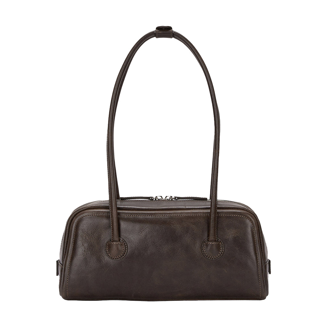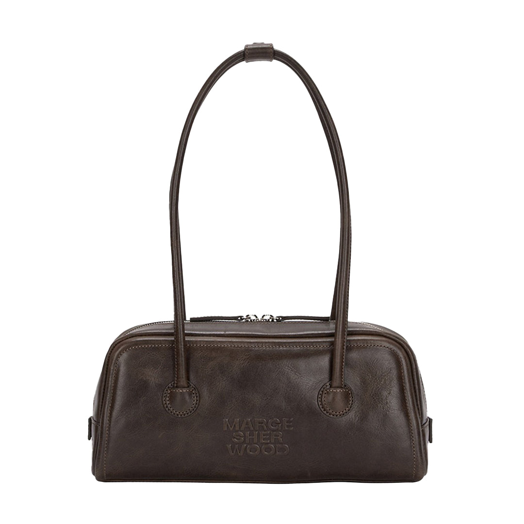 The Margesherwood Soft Baguette Bag in Washed Brown Pull Up featuring two shoulder strap with a zip-fastening closure and a slip pocket inside. Made from genuine leather, it includes the Margesherwood logo on the front and a branded lining.