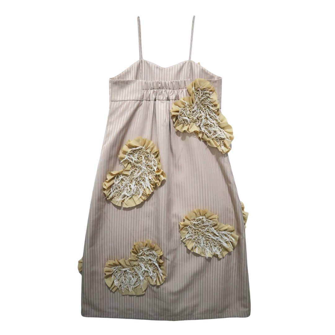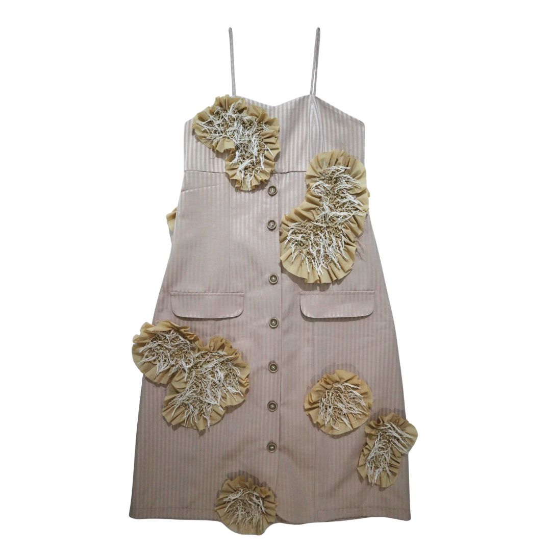 Shoulder strap dress dengan iyonono signature handmade patches yang tersebar di bagian depan dan belakang. Dress ini menggunakan kain bermotif garis vertikal, dilengkapi garis potongan princess di bagian depan, kancing dengan detail saku, serta kerutan karet di bagian belakang untuk kenyamanan