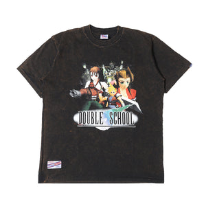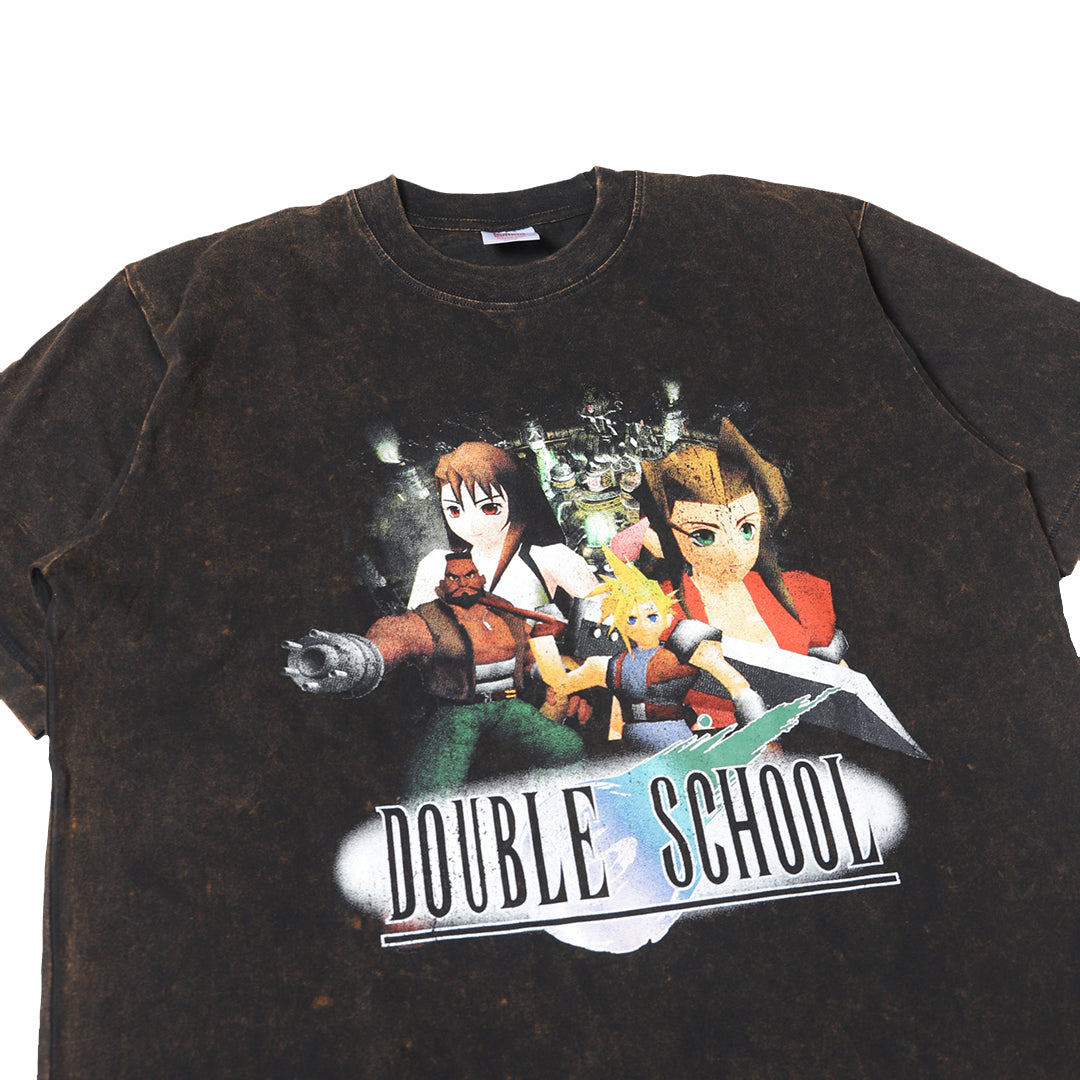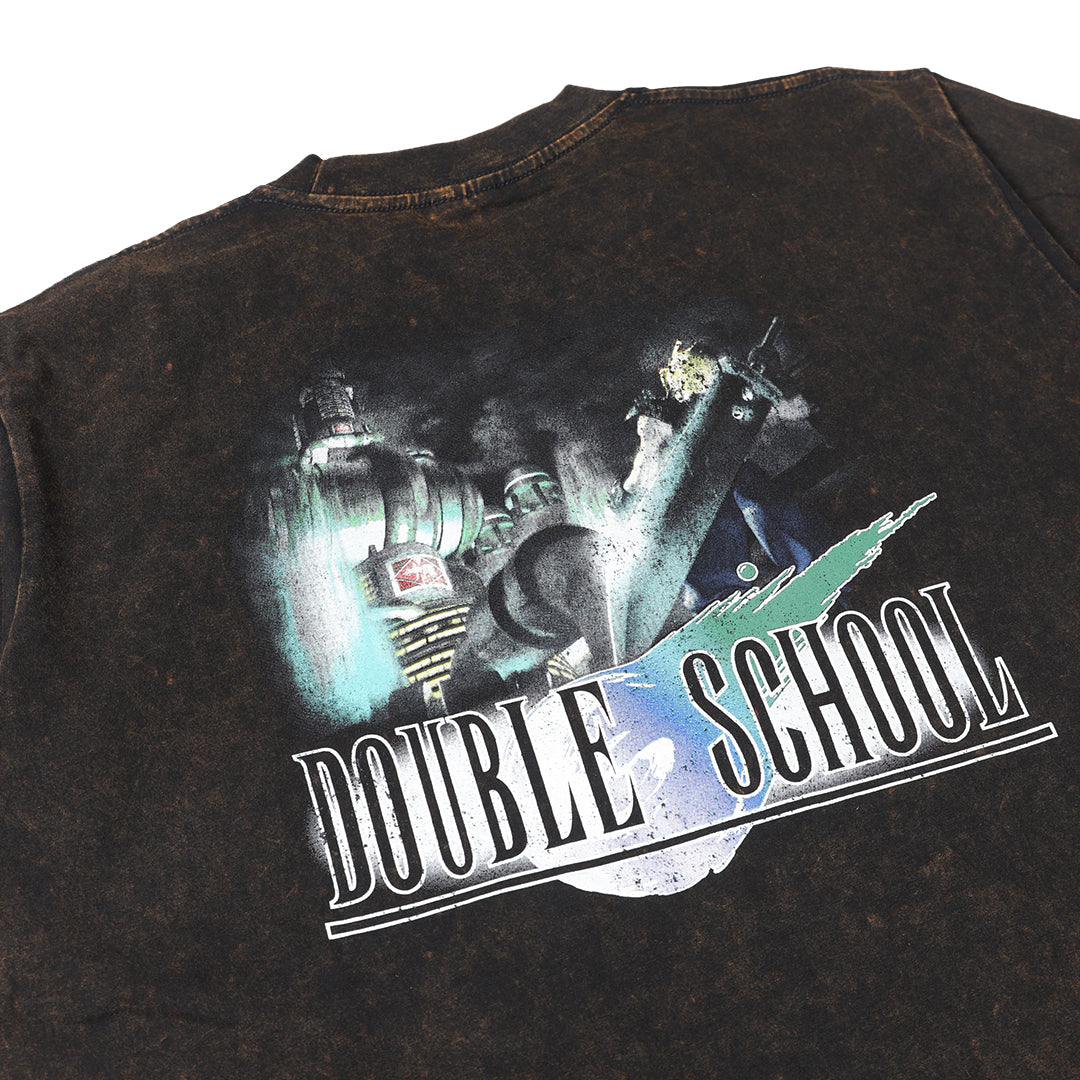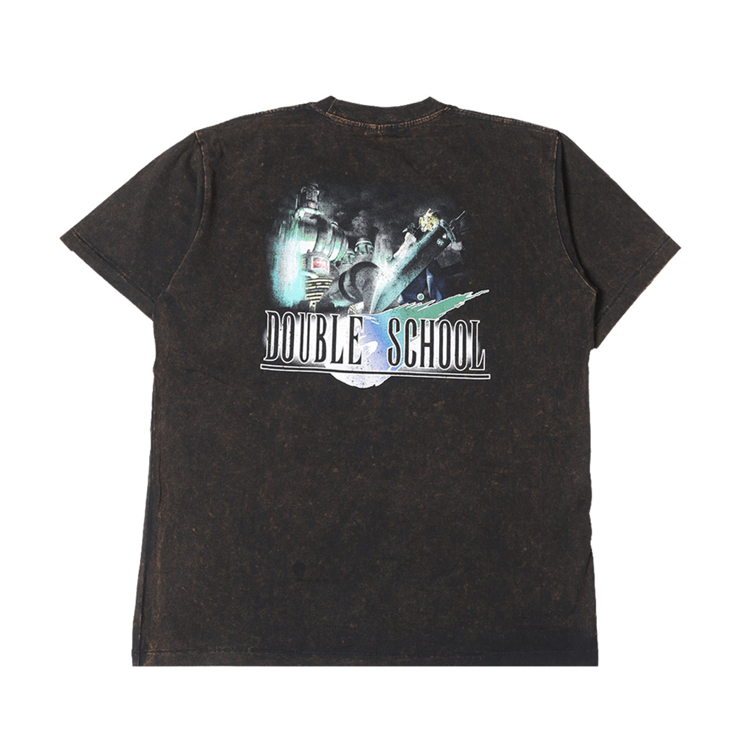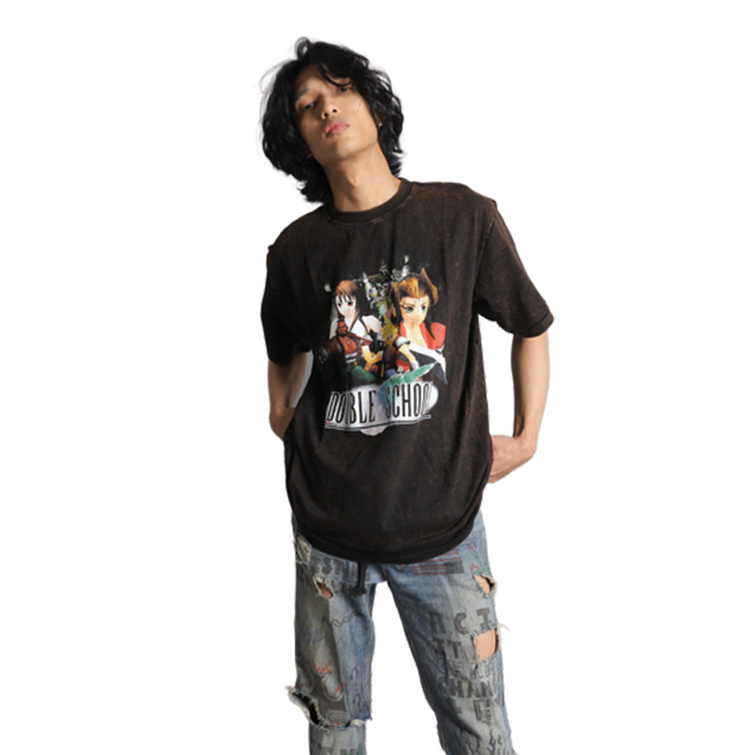 Stone-washed t-shirt with custom graphics at front and back. Ribbed collar. Made in Indonesia.