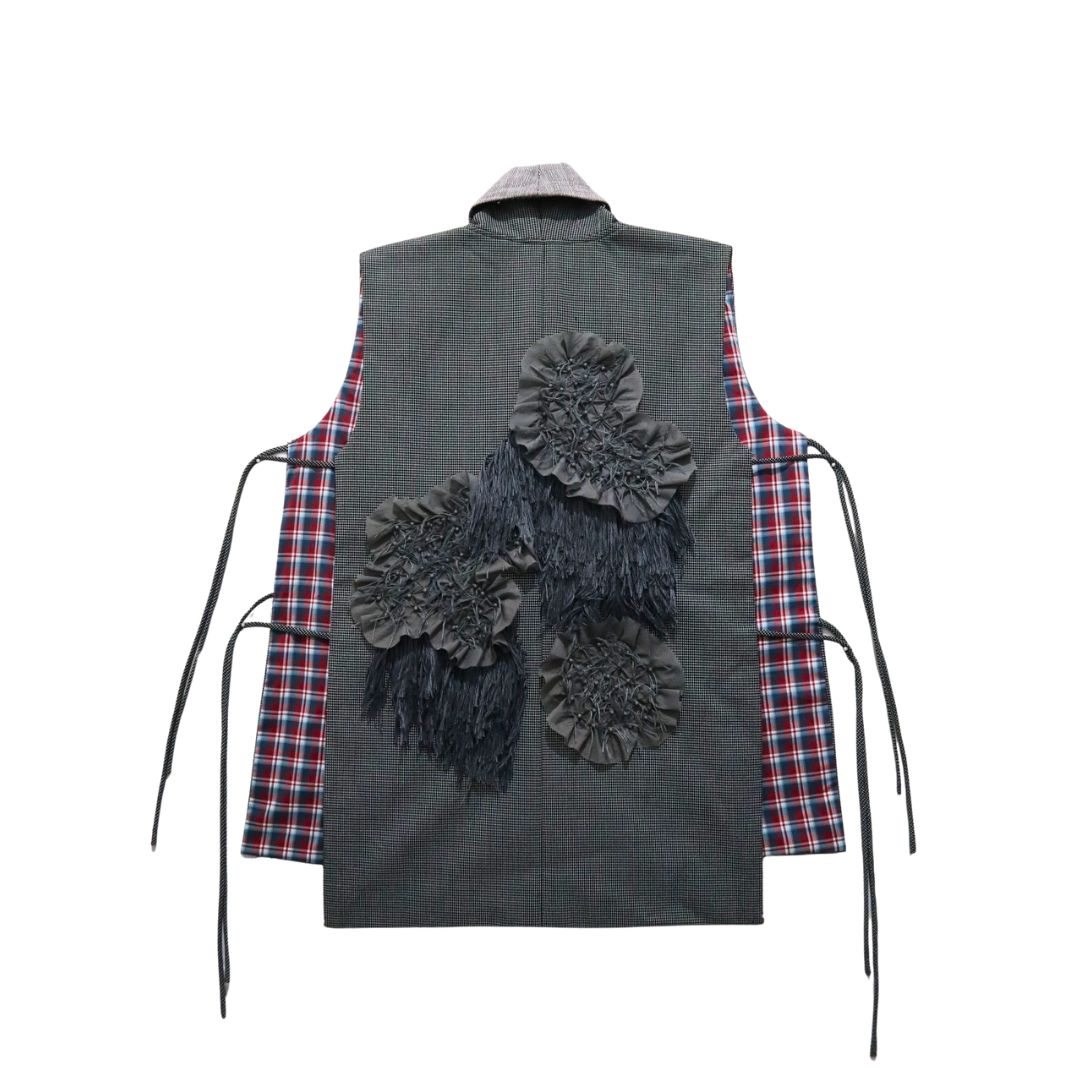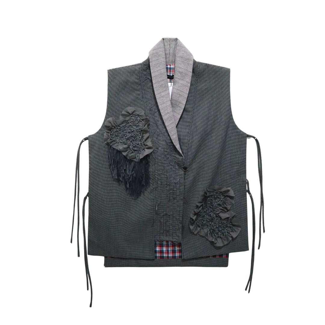 Vest dengan kerah shawl, dengan bukaan kancing di bagian depan, dan detail tali di bagian samping. Bagian utama bermotif kotak kecil dengan lapisan kain kotak merah-biru. Dihiasi patch handmade khas iyonono bertekstur tiga dimensi di bagian depan dan belakang