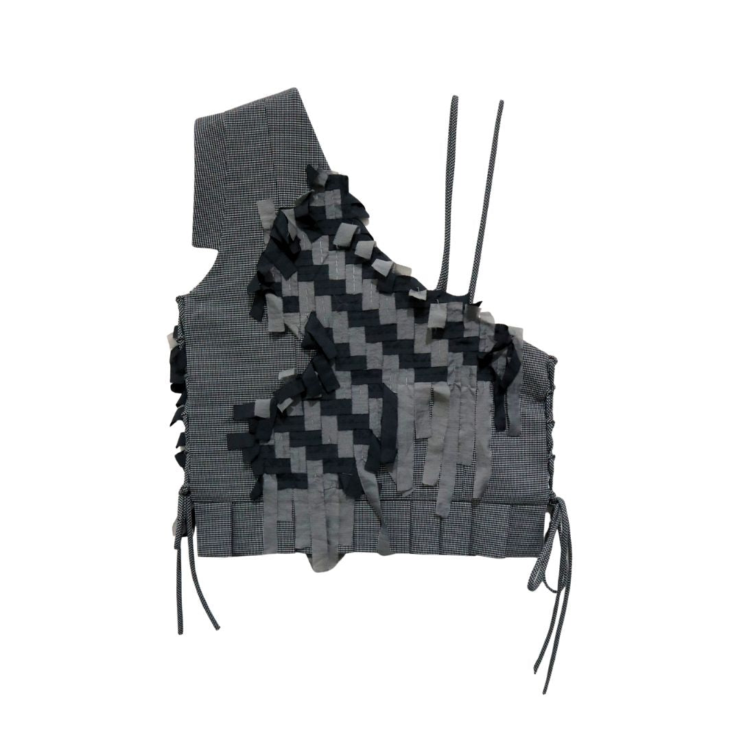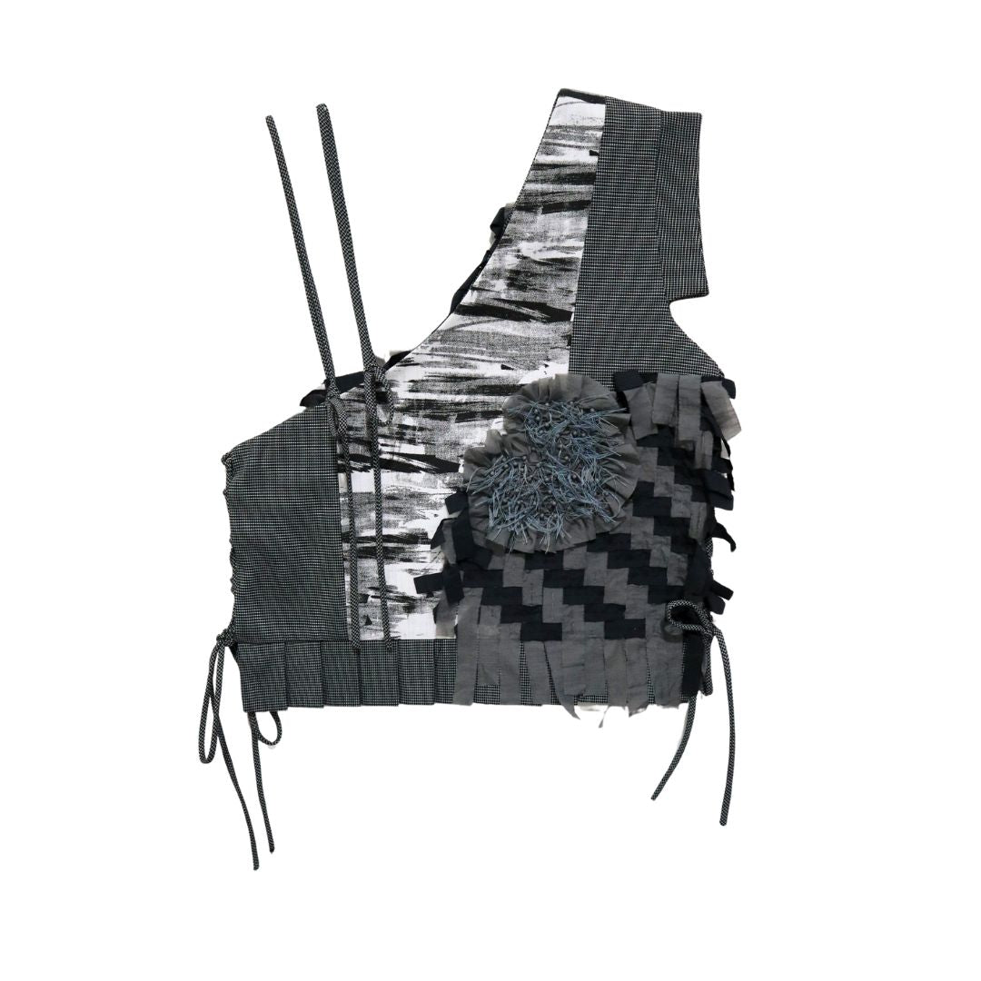 Vest crop asimetris dengan detail tali panjang di bahu dan ikatan samping. Bagian bawah dilengkapi detail lipit untuk memberi aksen bentuk. Bagian depan dihiasi patch handmade khas iyonono serta tekstur anyaman yang tersebar hingga ke bagian belakang, menciptakan tampilan eksperimental dan artistik.